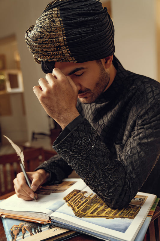 BLACK SHERWANI WITH AFGHANI COLLAR (ORDER VIA BOOK AN APPOINTMENT ONLY)