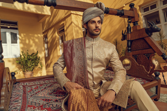 OPULENT BEIGE HAND EMBROIDERED SHERWANI (ORDER VIA BOOK AN APPOINTMENT ONLY)