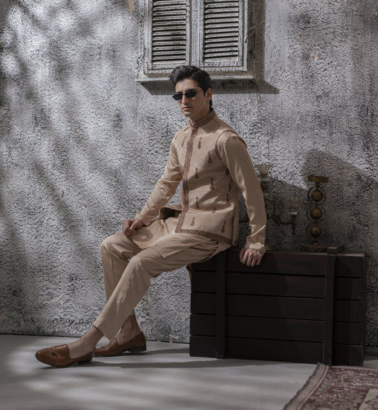 Sand Beige Hand Embroidered Waist Coat with Kurta Pajama