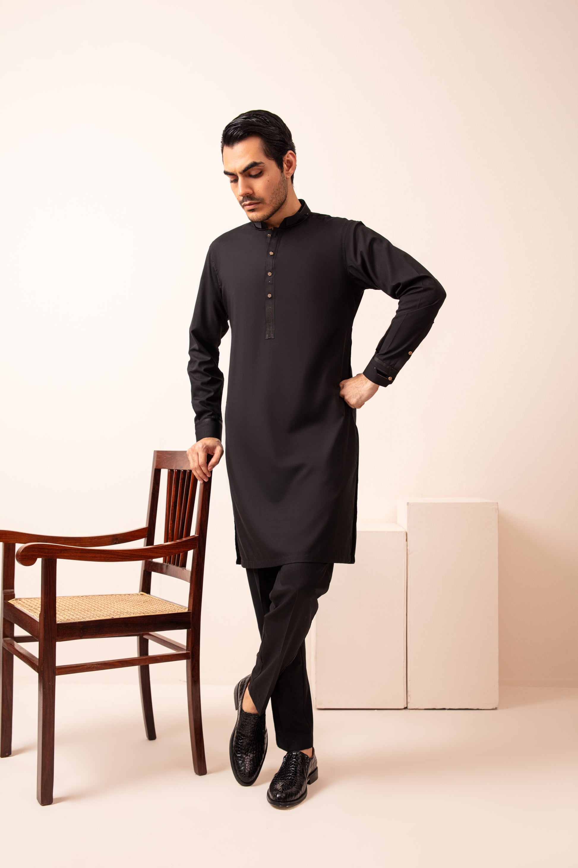 Ghalib Qureshi's Black Blended Kurta Pajama, featuring subtle detailing on the cuffs, button placket, and collar. This versatile ensemble is perfect for both daily wear and formal occasions, combining comfort with a touch of sophistication. Ideal for those seeking an elegant yet understated look.