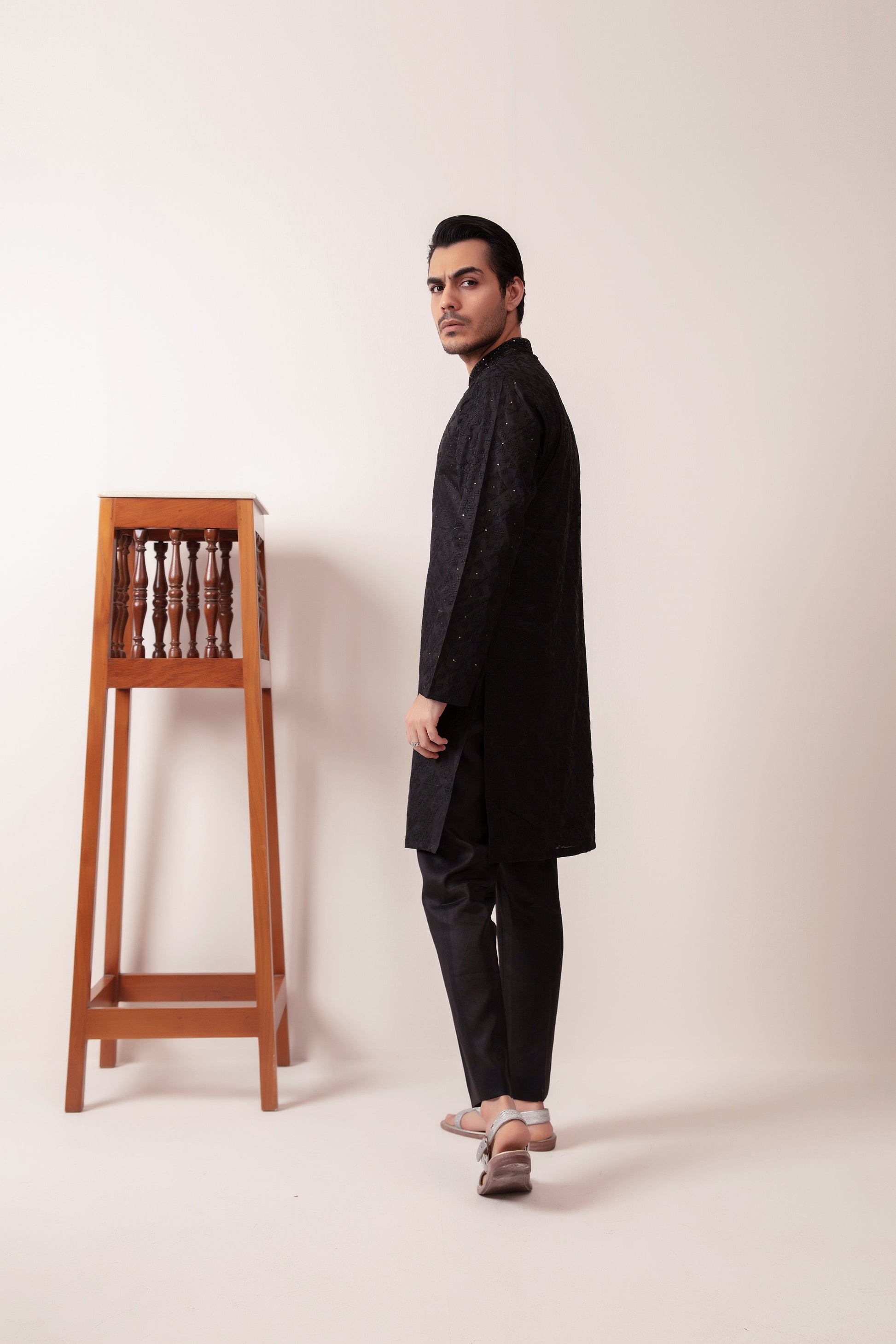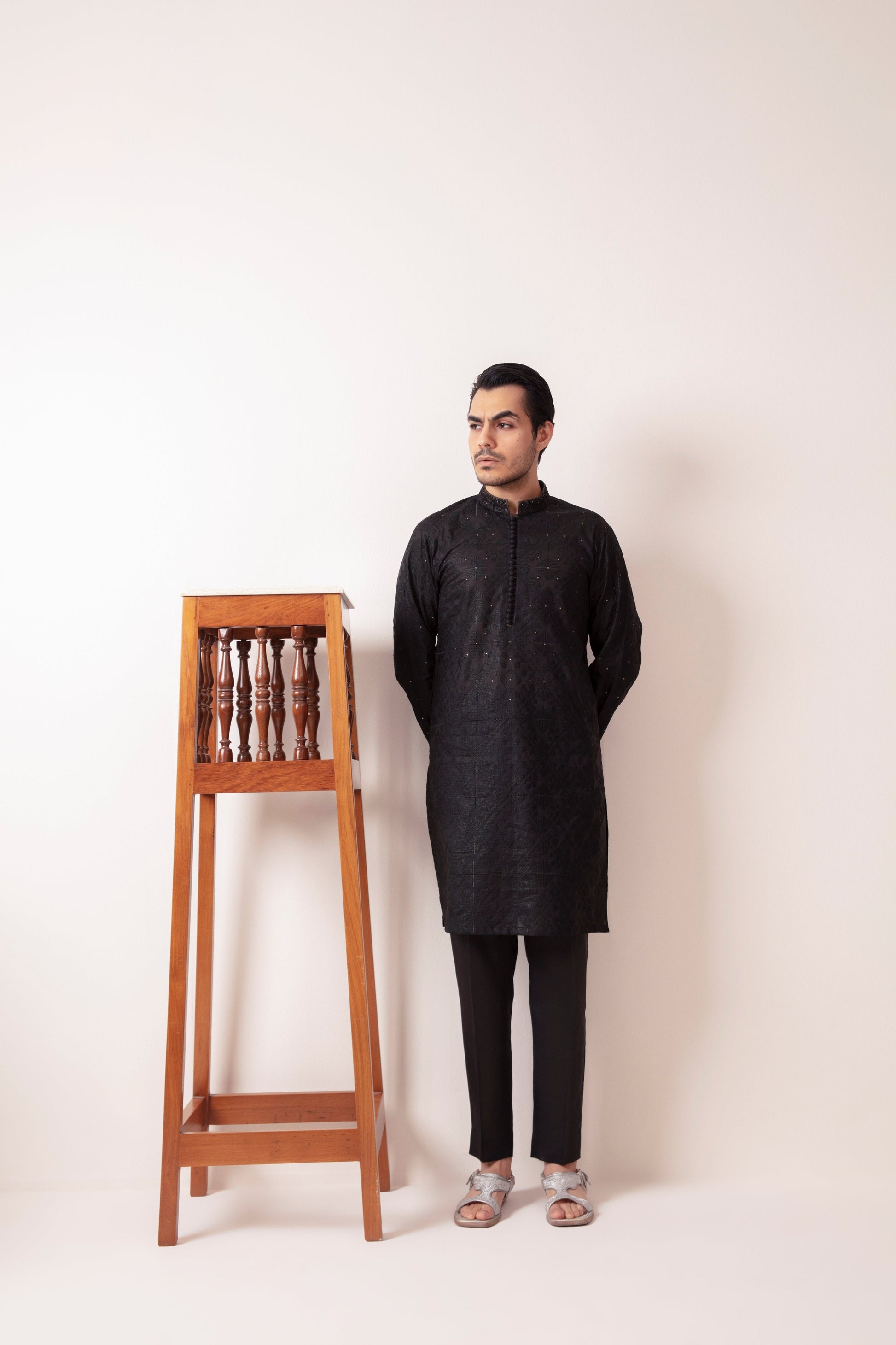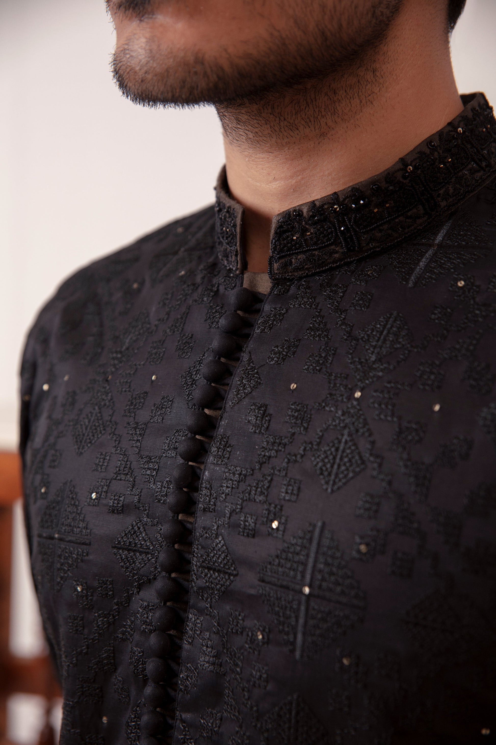 Ghalib Qureshi's Black Embroidered Kurta with Loop Buttons and Intricate Handwork on the Collar, paired with a matching plain pajama. Made from very premium Irish fabric, this ensemble is perfect for summer and festive seasons. The detailed embroidery and handwork exude sophistication, making it a standout choice for any special occasion.