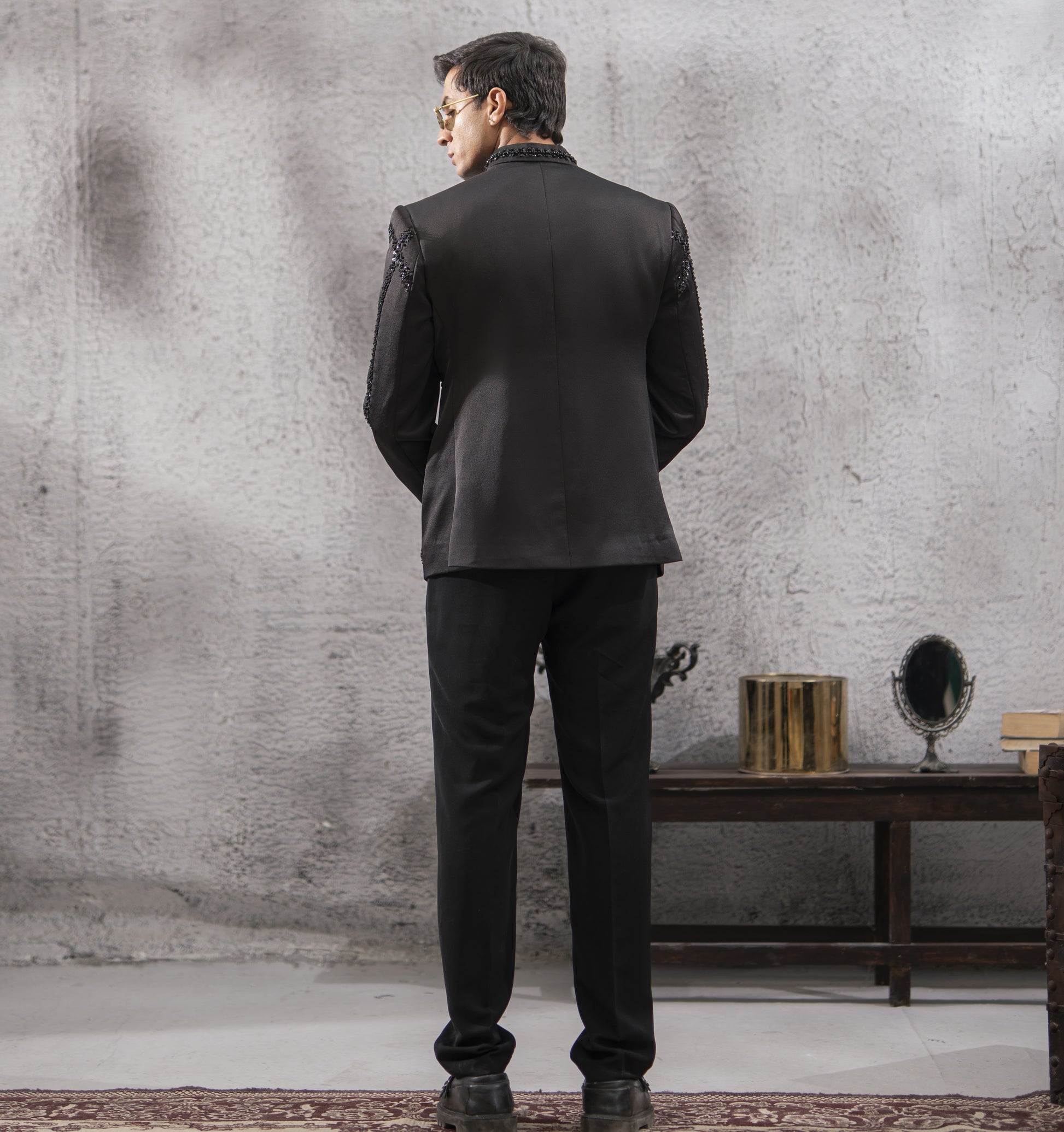 This black prince coat is defined by its structured silhouette and refined hand embroidery, applied with restraint to preserve clarity in form. The embroidery is placed to enhance the lines of the coat rather than overwhelm it, allowing the tailoring to remain the focal point. Designed for formal and ceremonial wear, the piece carries a quiet strength, offering presence and sophistication without excess.