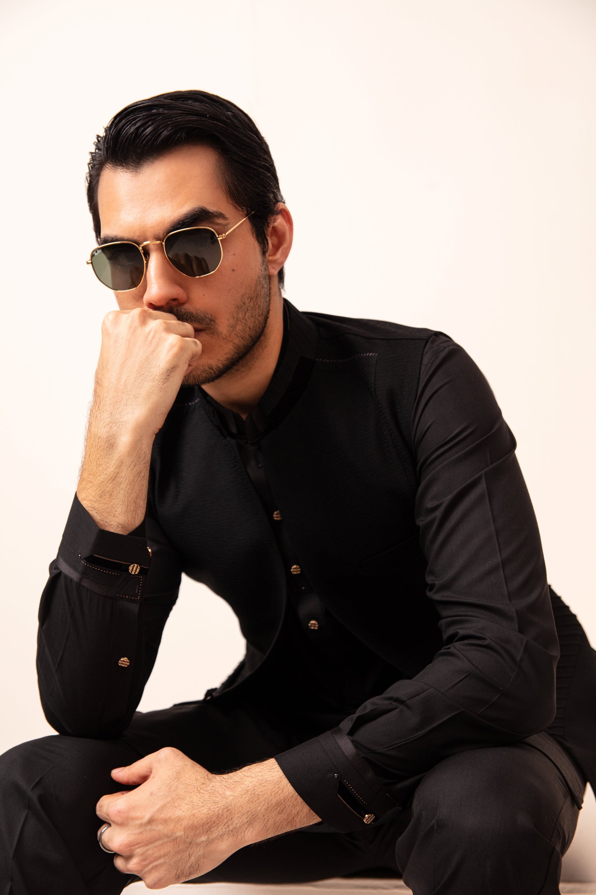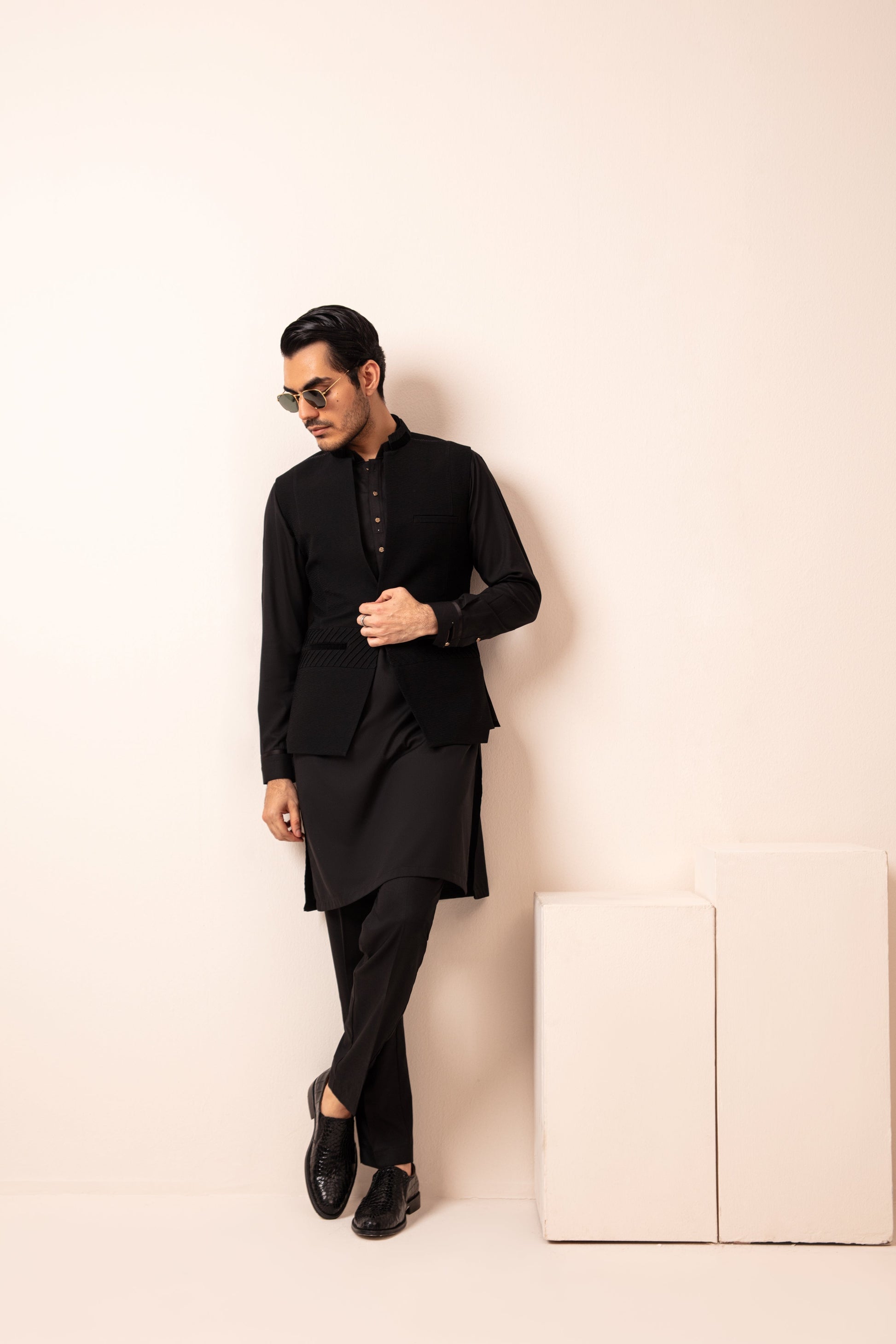 Ghalib Qureshi Black waistcoat, featuring refined detailing and a unique cut, perfect for festive and formal occasions.