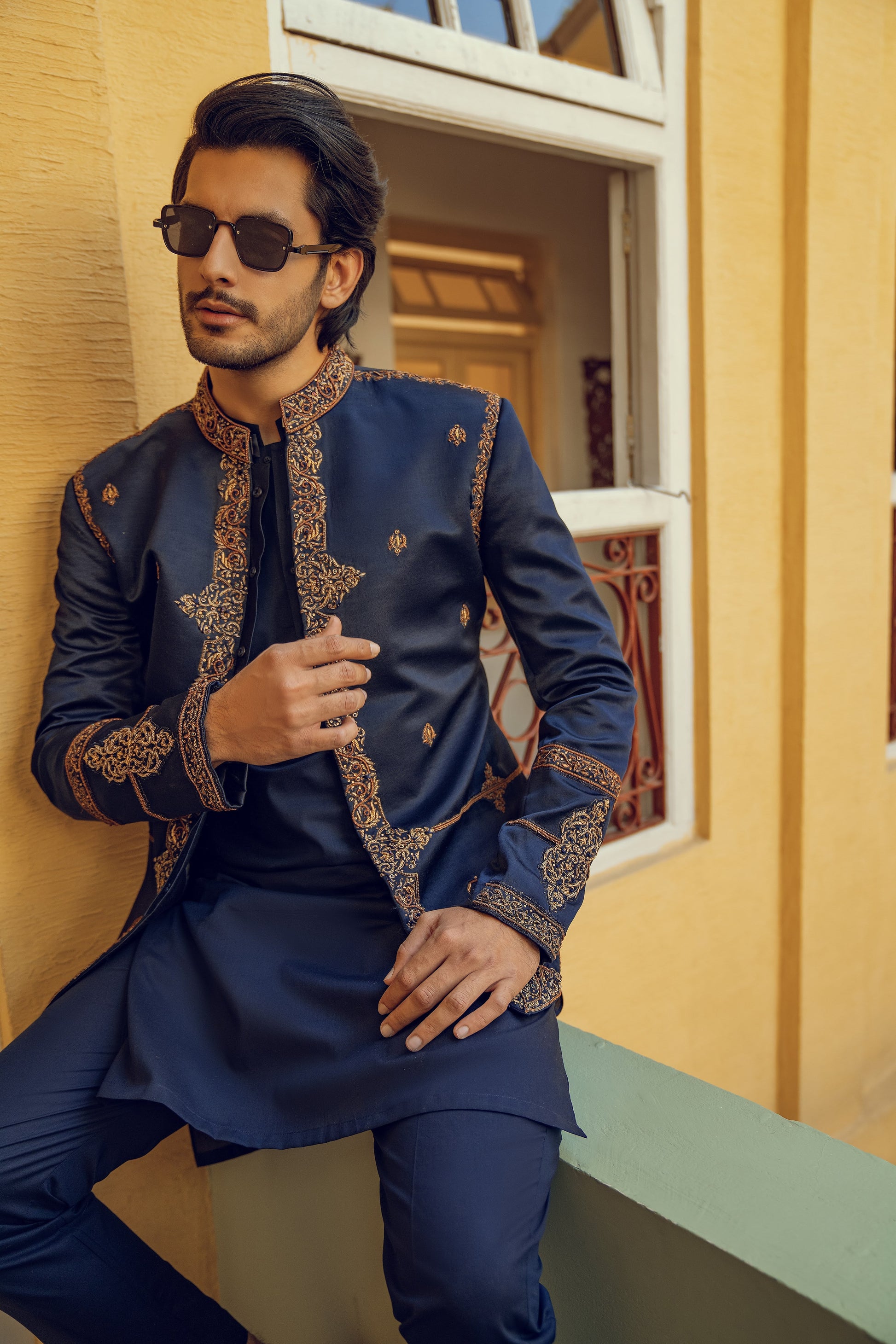 BLUE EMBROIDERED PRINCE COAT with BLUE KURTA PAJAMA