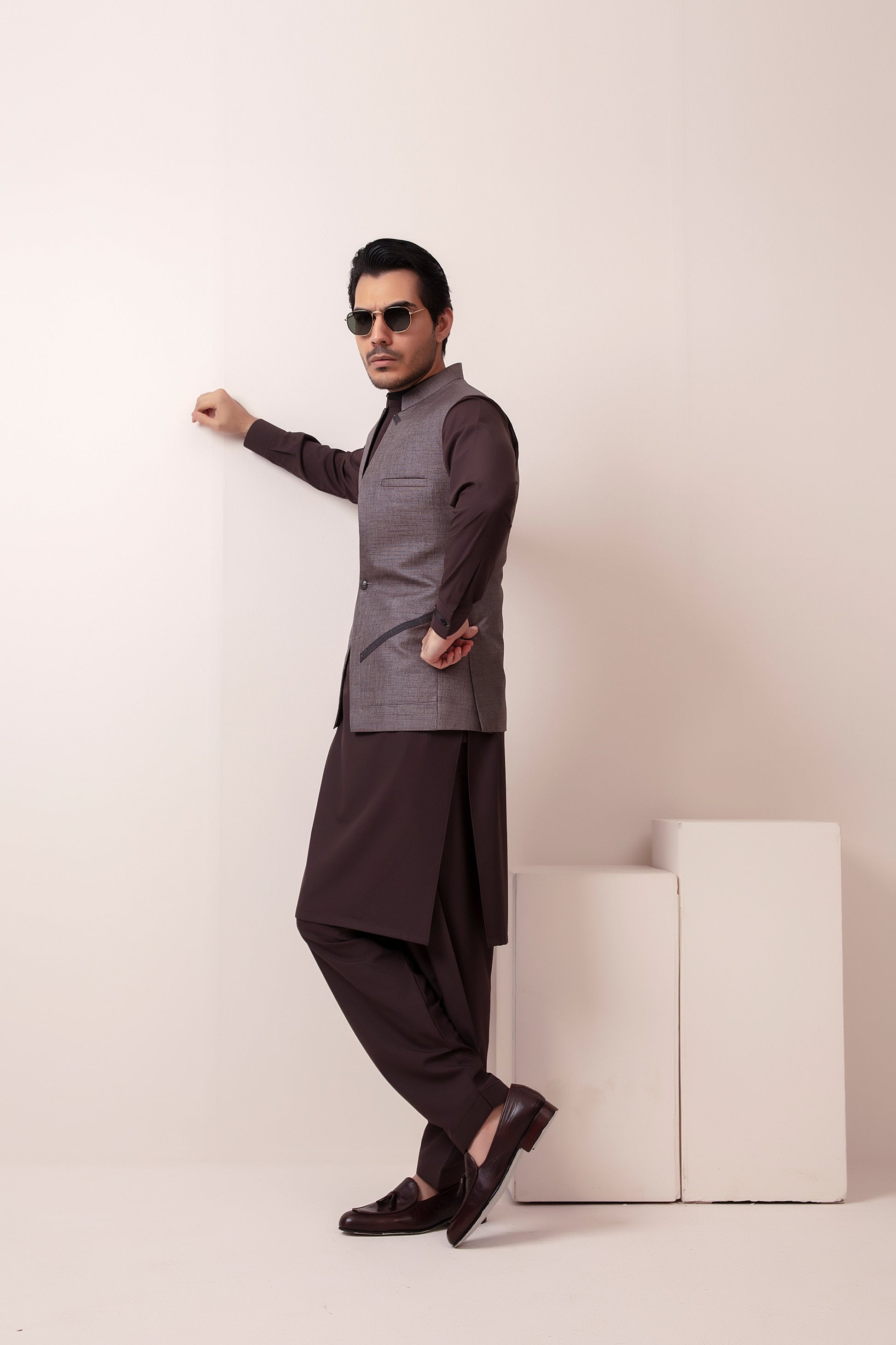Ghalib Qureshi's Burgundy shade waistcoat, featuring intricate detailing and a distinctive cut that sets it apart from the ordinary.