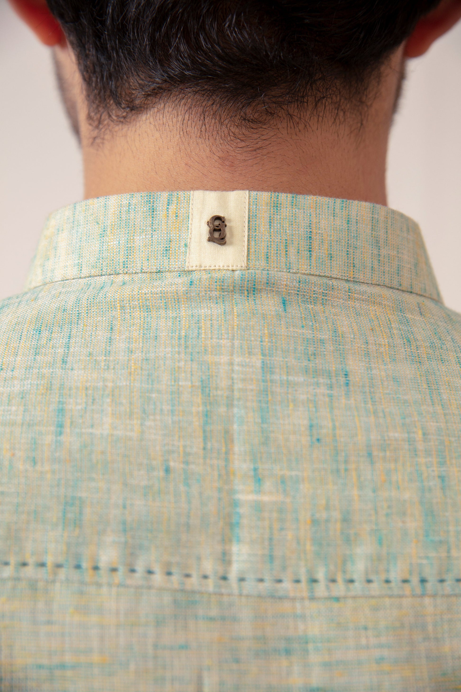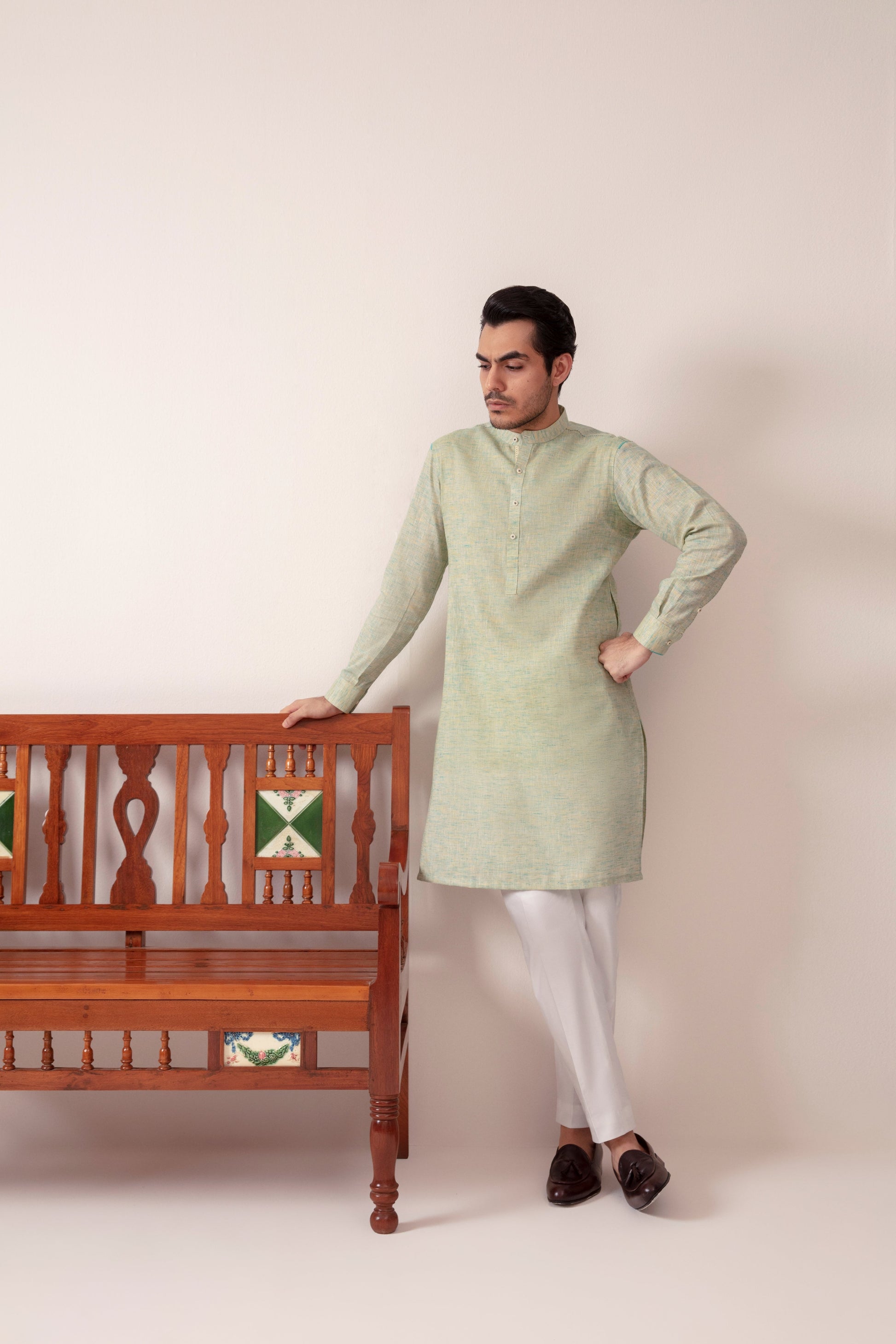 Ghalib Qureshi's Irish Green Kurta with White Pajama. Crafted from premium fabric, this outfit features minor detailing that enhances its sophisticated look. While not ideal for the heat of summer, it exudes a cool and refreshing vibe, perfect for those looking to embrace a summer aesthetic with a touch of distinction.