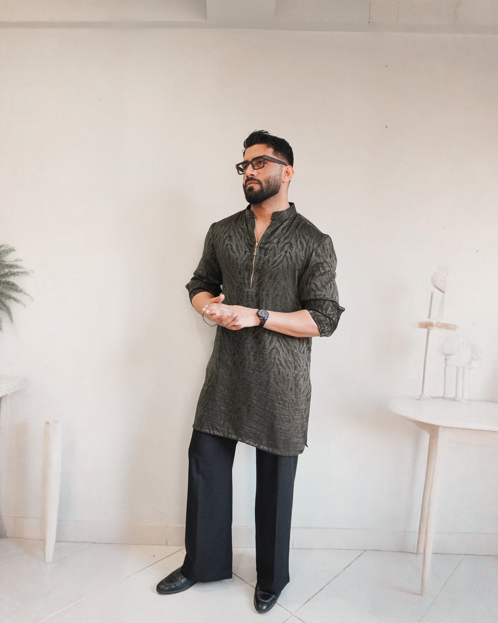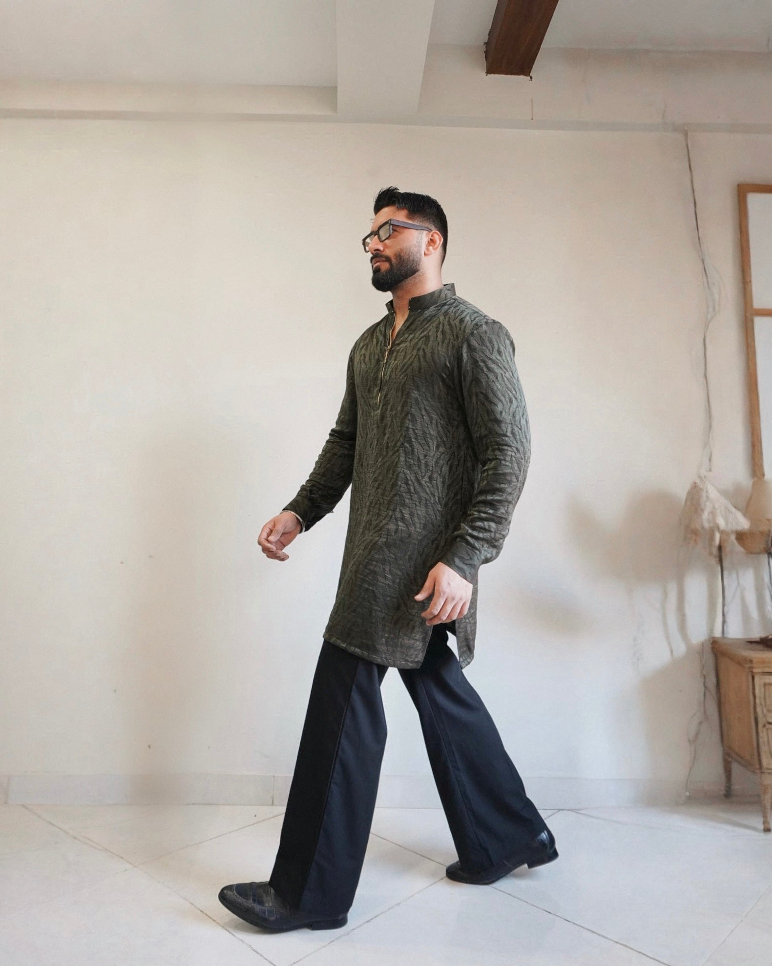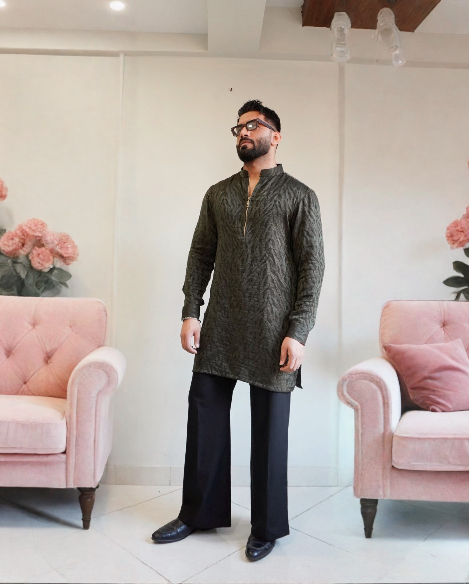 ''ZAUQ' Trendy green zipper kurta paired with bellbottoms. Modern silhouette, ideal for semi-formal and festive events.