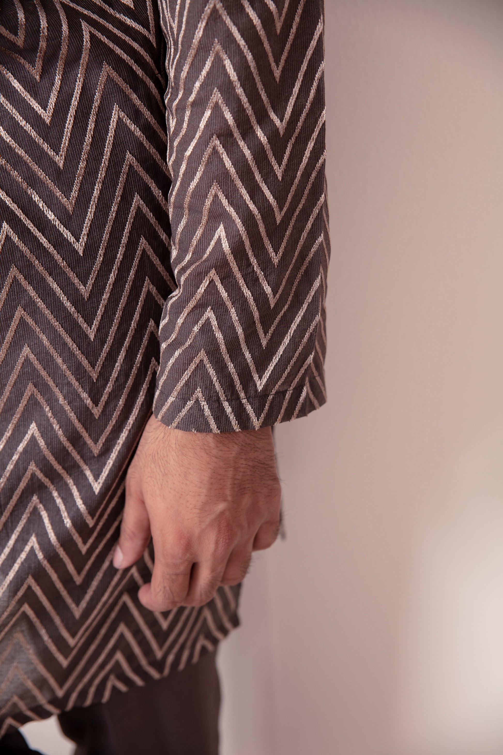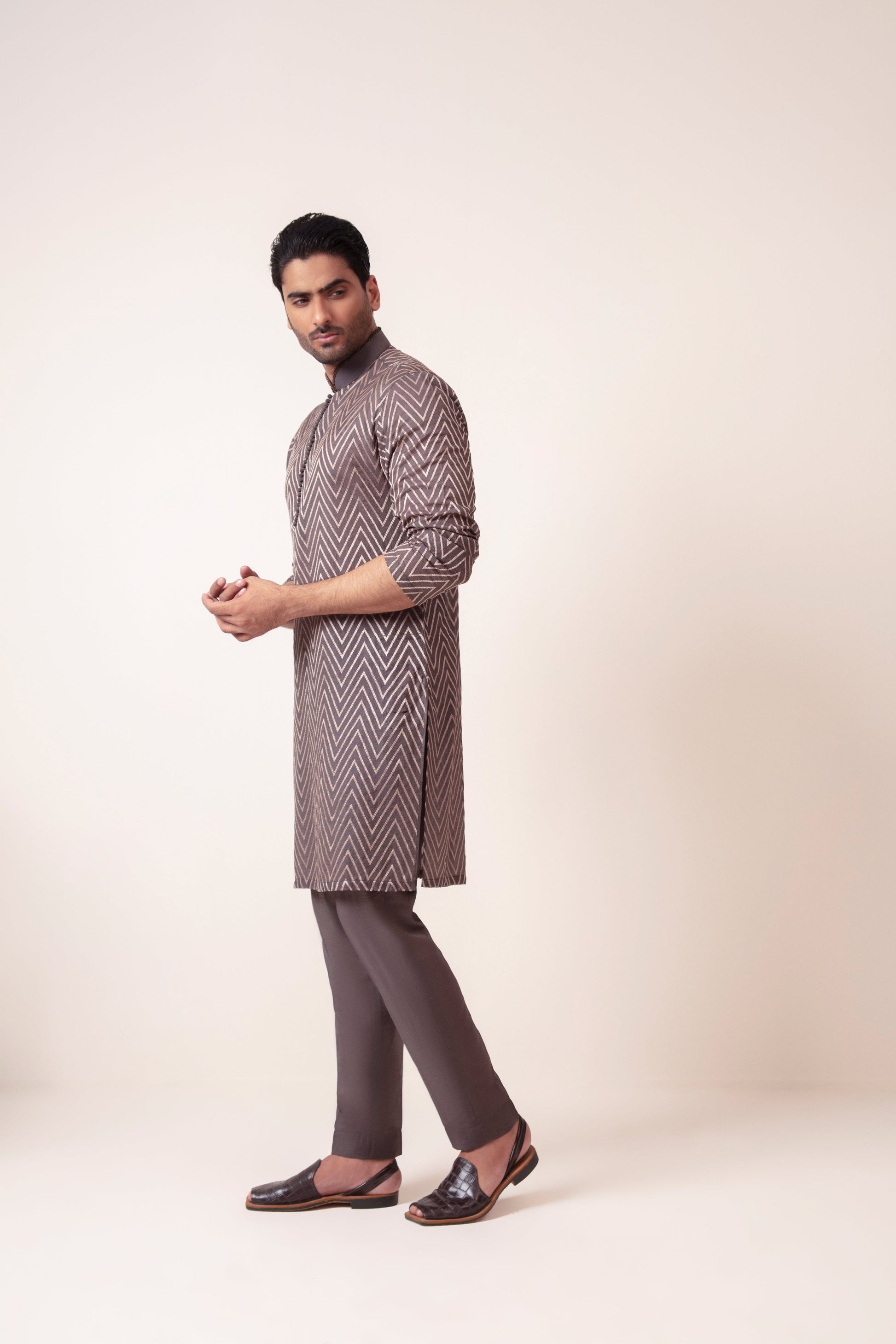 Ghalib Qureshi's Brownish Grey Chevron Embroidered Kurta with Loop Buttons and Minor Handwork on the Collar, paired with a matching plain pajama. Crafted from premium fancy fabric, this ensemble is perfect for summer and festive seasons.