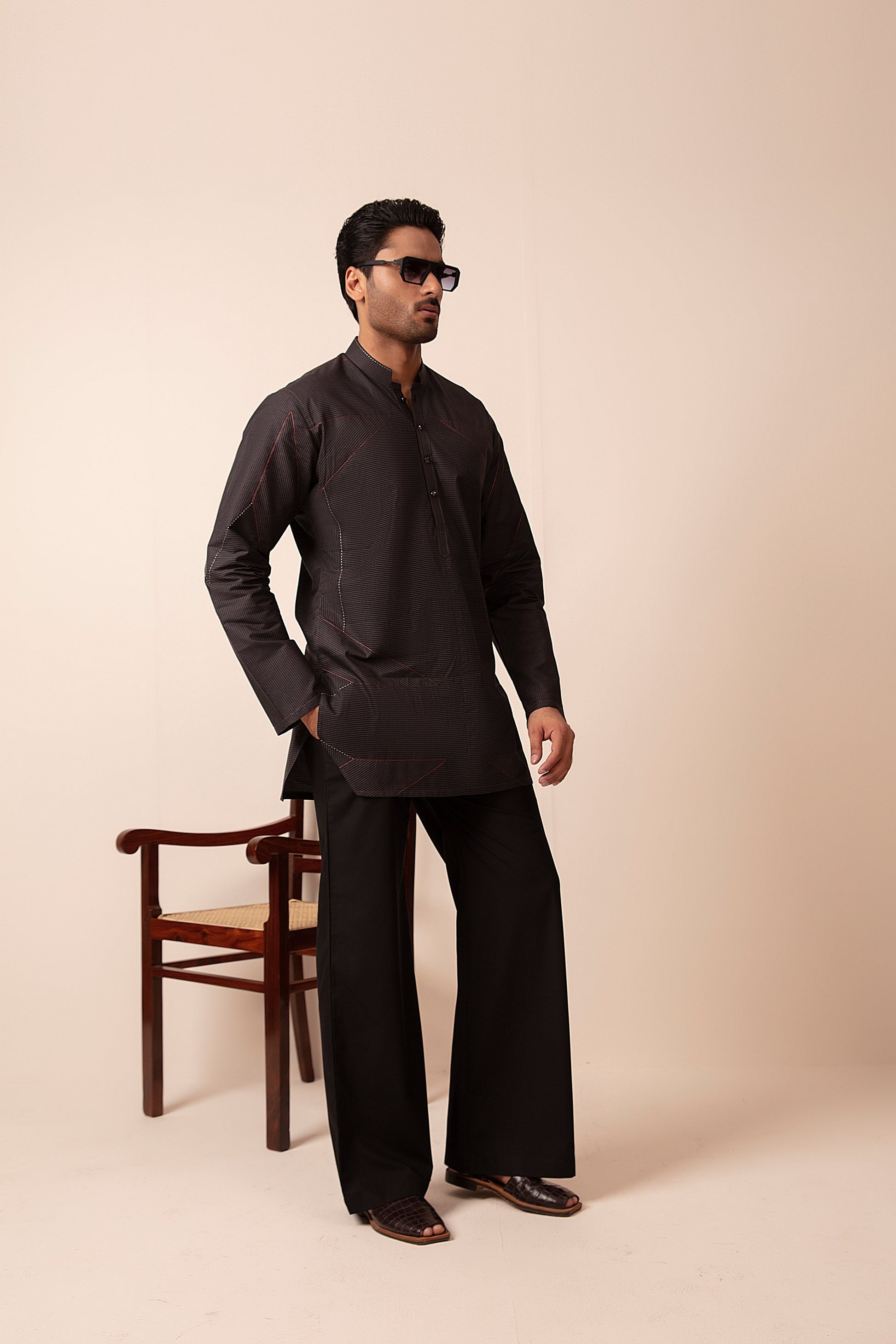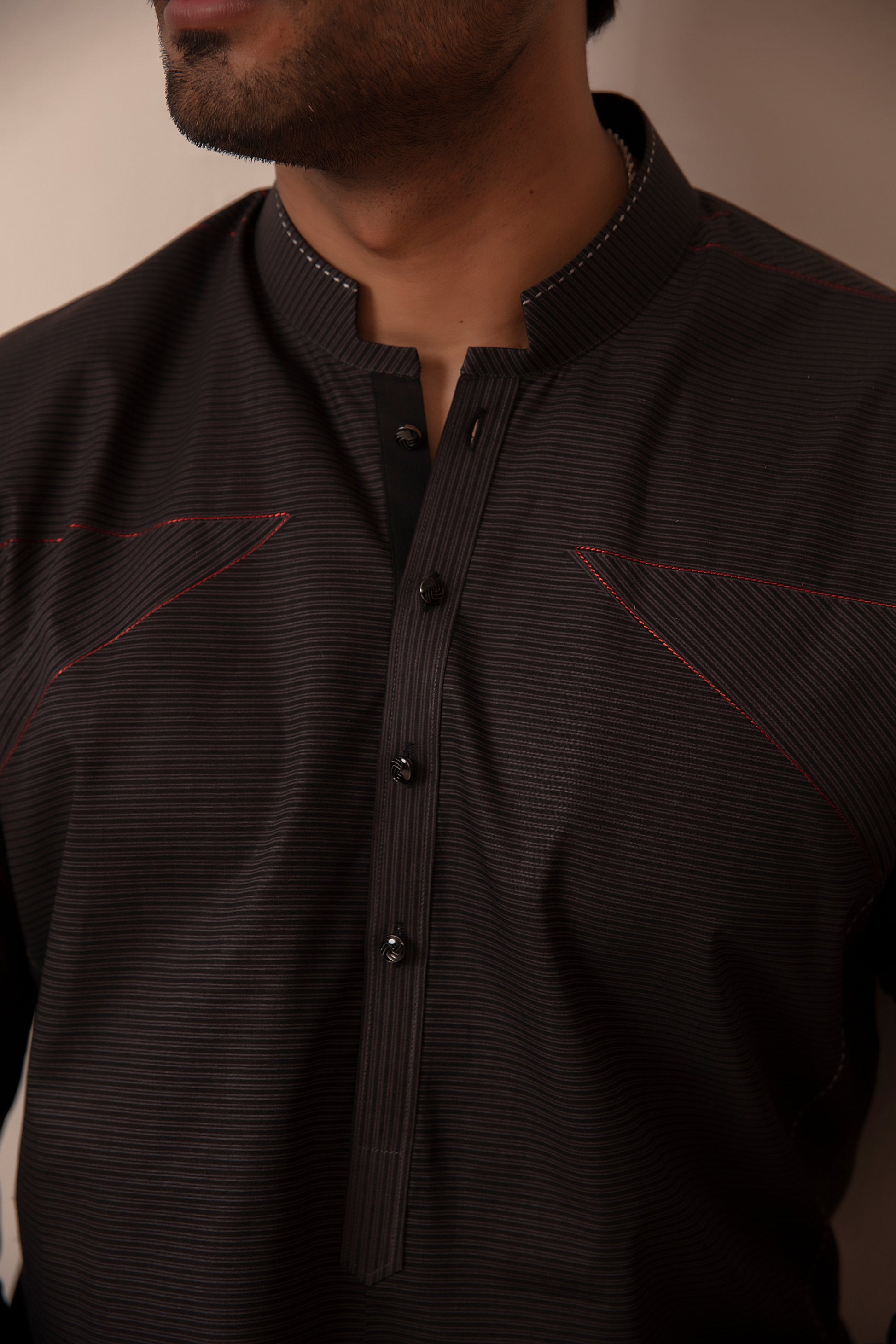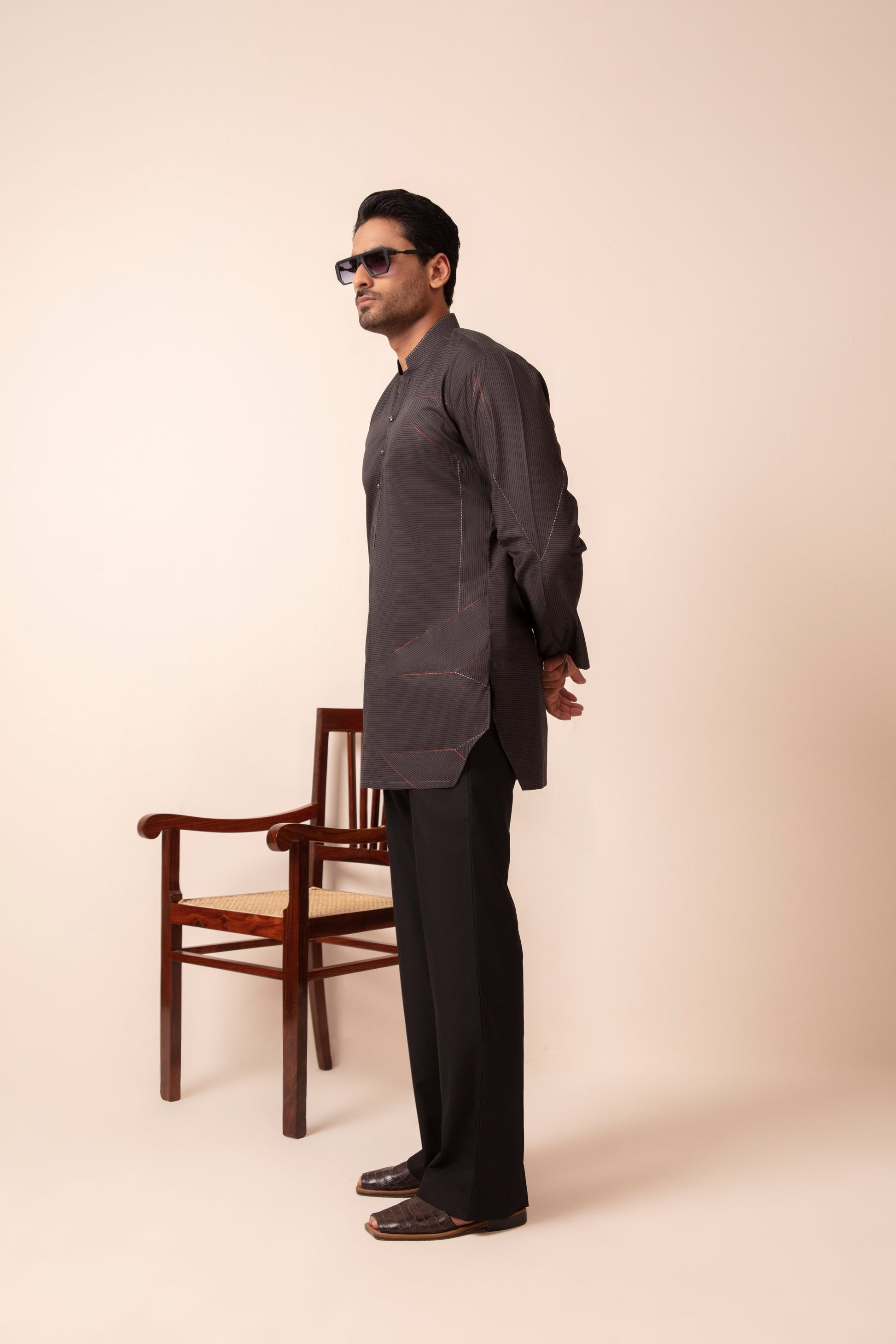 Grey Striped Cotton Short Kurta paired with Black Bell Bottom Pajama effortlessly blends Eastern and Western aesthetics. Featuring a sleek design with subtle thread work on the front, sleeves, and collar, this ensemble seamlessly transitions between traditional and modern fashion sensibilities. Whether you're attending a cultural event or a casual outing, it's the perfect choice for those who appreciate the fusion of diverse styles.