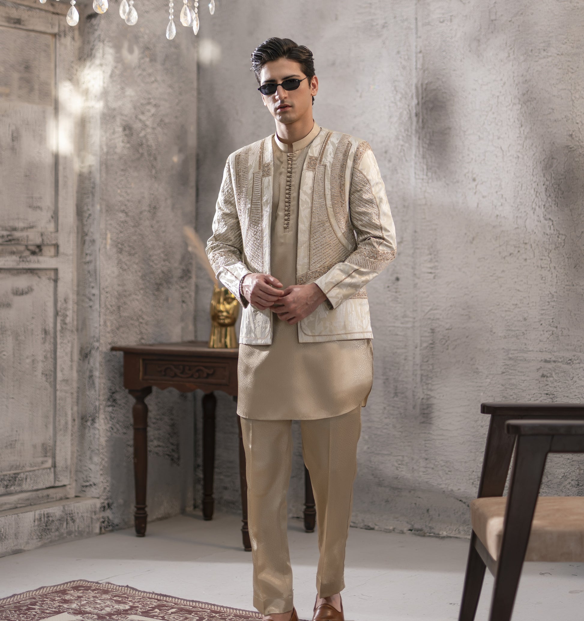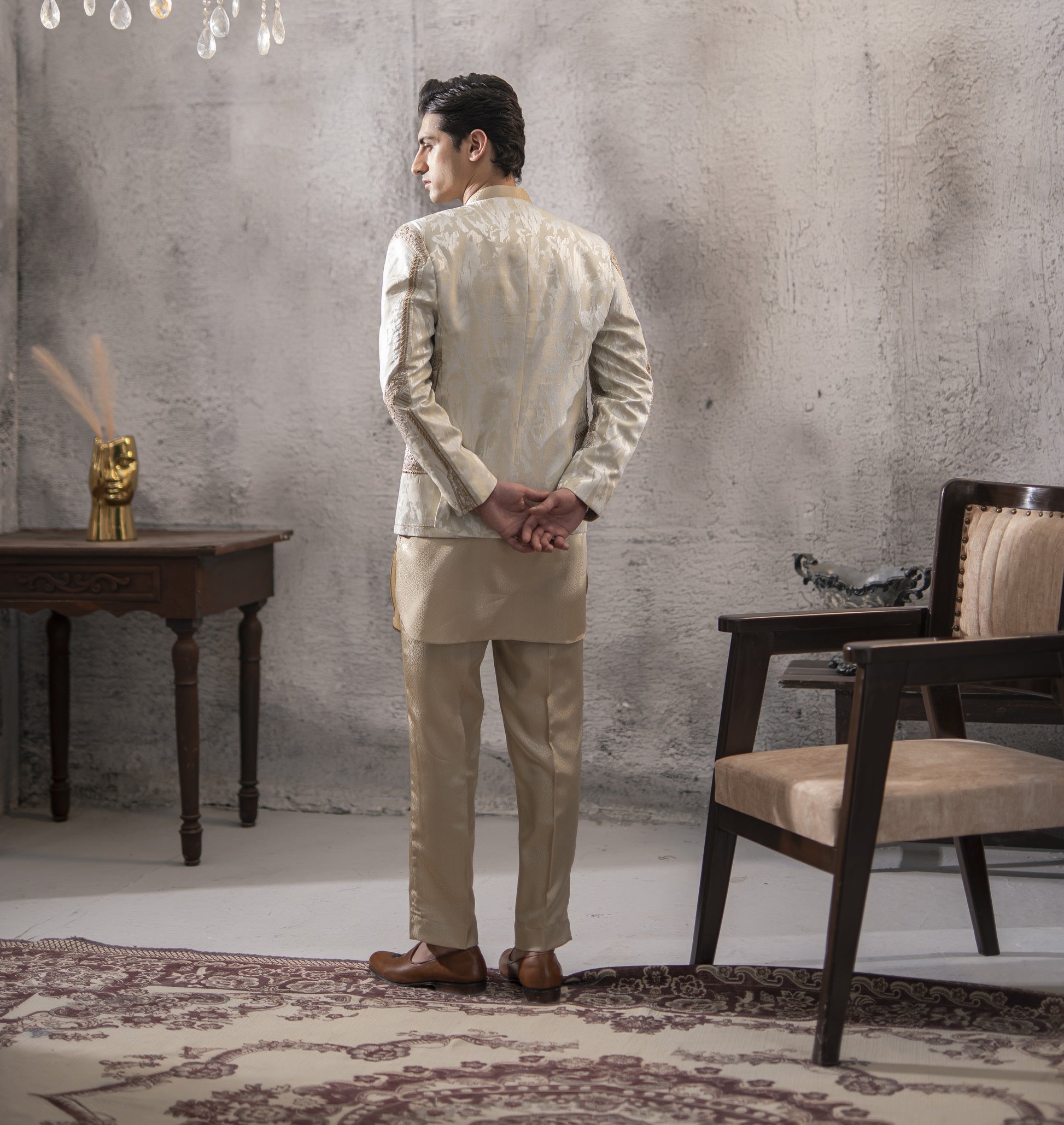 This greyish monkey jacket is defined by its subtle hand embroidery in golden threads, applied to enhance the structured silhouette with quiet sophistication. The open-front design reveals a jacquard inner, adding depth and texture to the ensemble. Designed for formal and ceremonial occasions, the set balances traditional craftsmanship with contemporary tailoring, offering presence and refinement without excess.