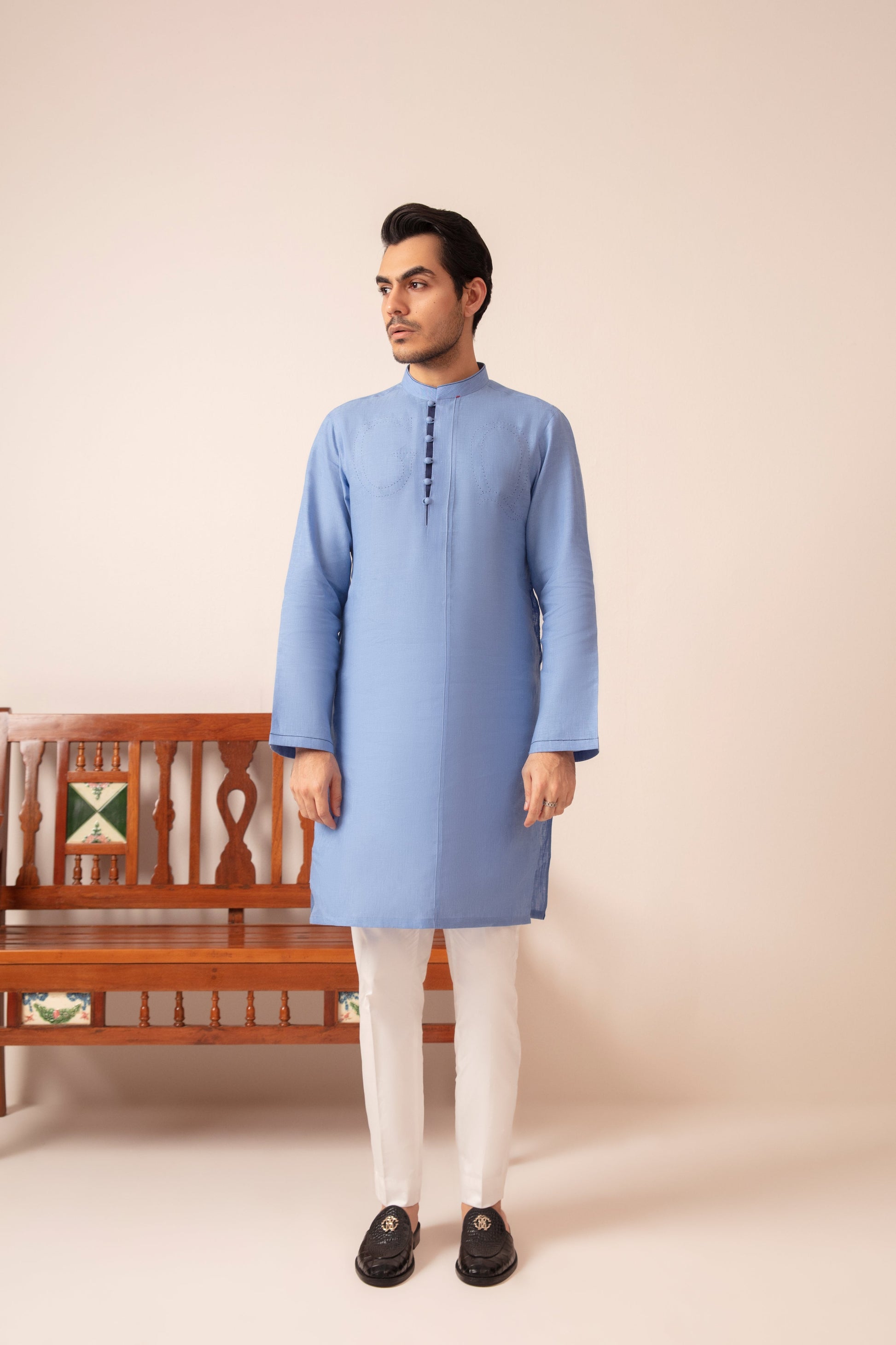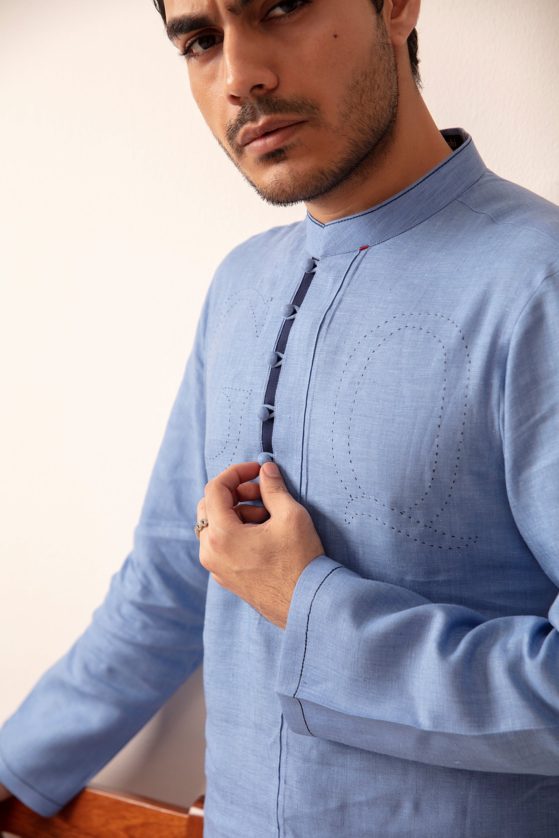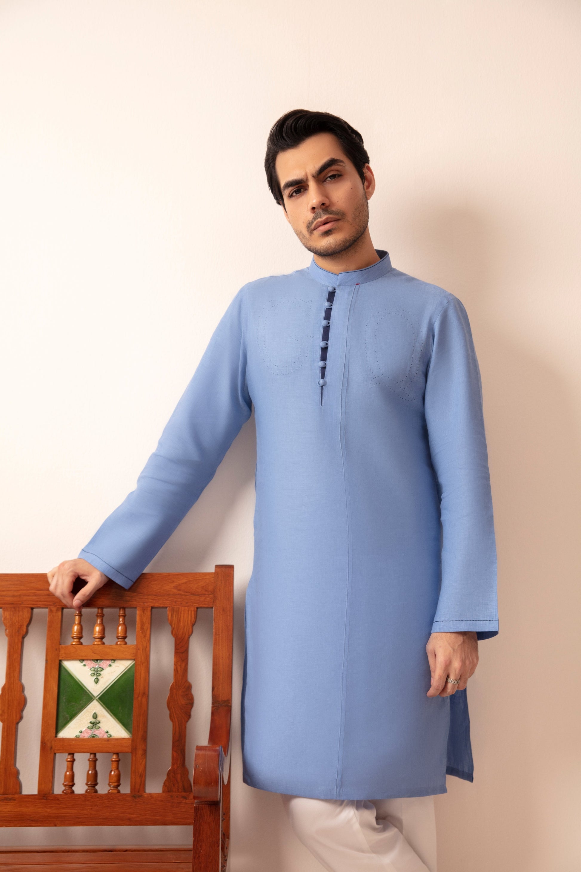 Elevate your summer style with our Irish Blue Kurta and White Pajama set. Crafted from lightweight Irish fabric, it offers superior comfort for warm days. Featuring intricate pintex detailing and "GQ" embroidery on the front, it effortlessly blends tradition with modernity