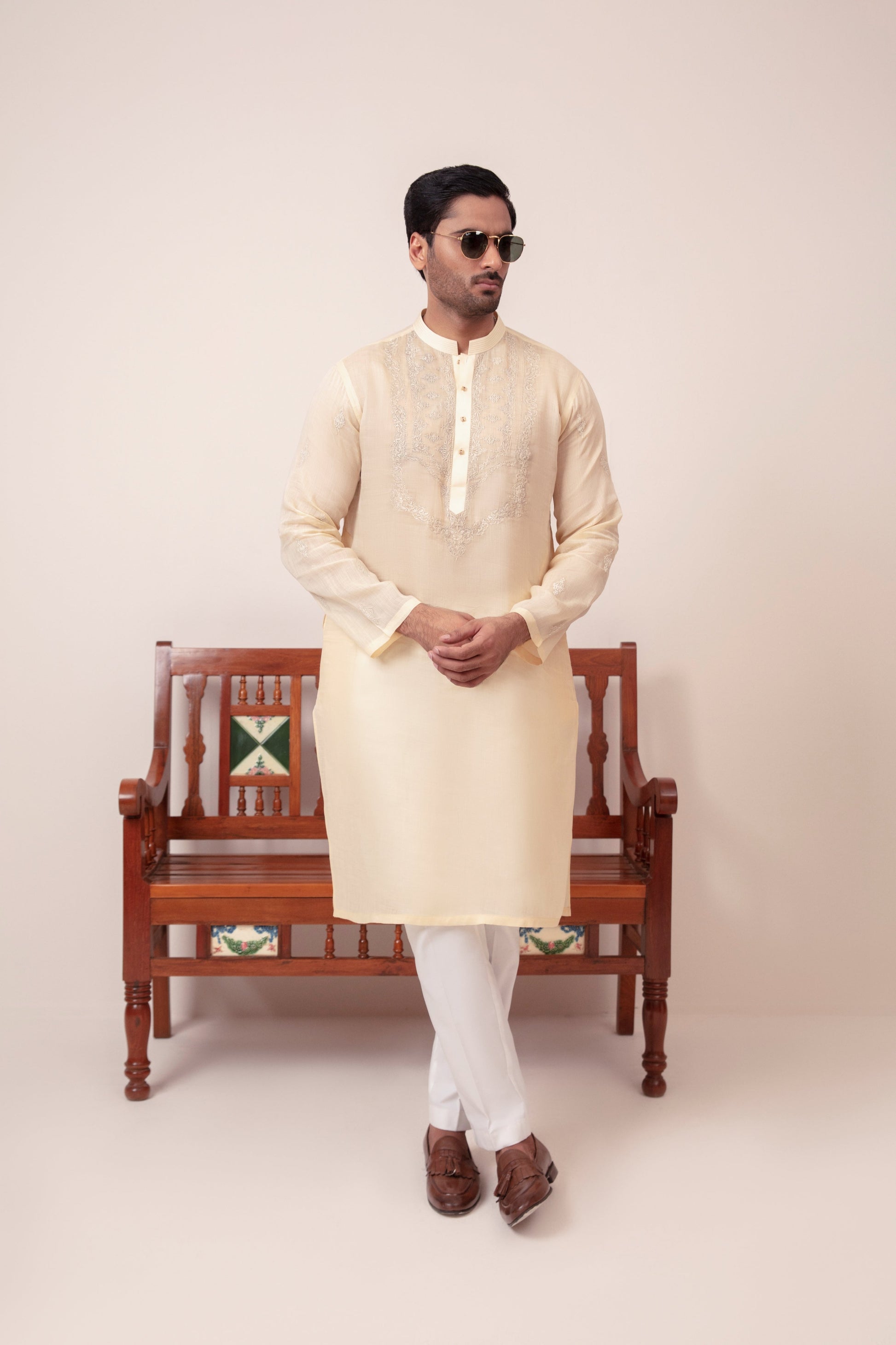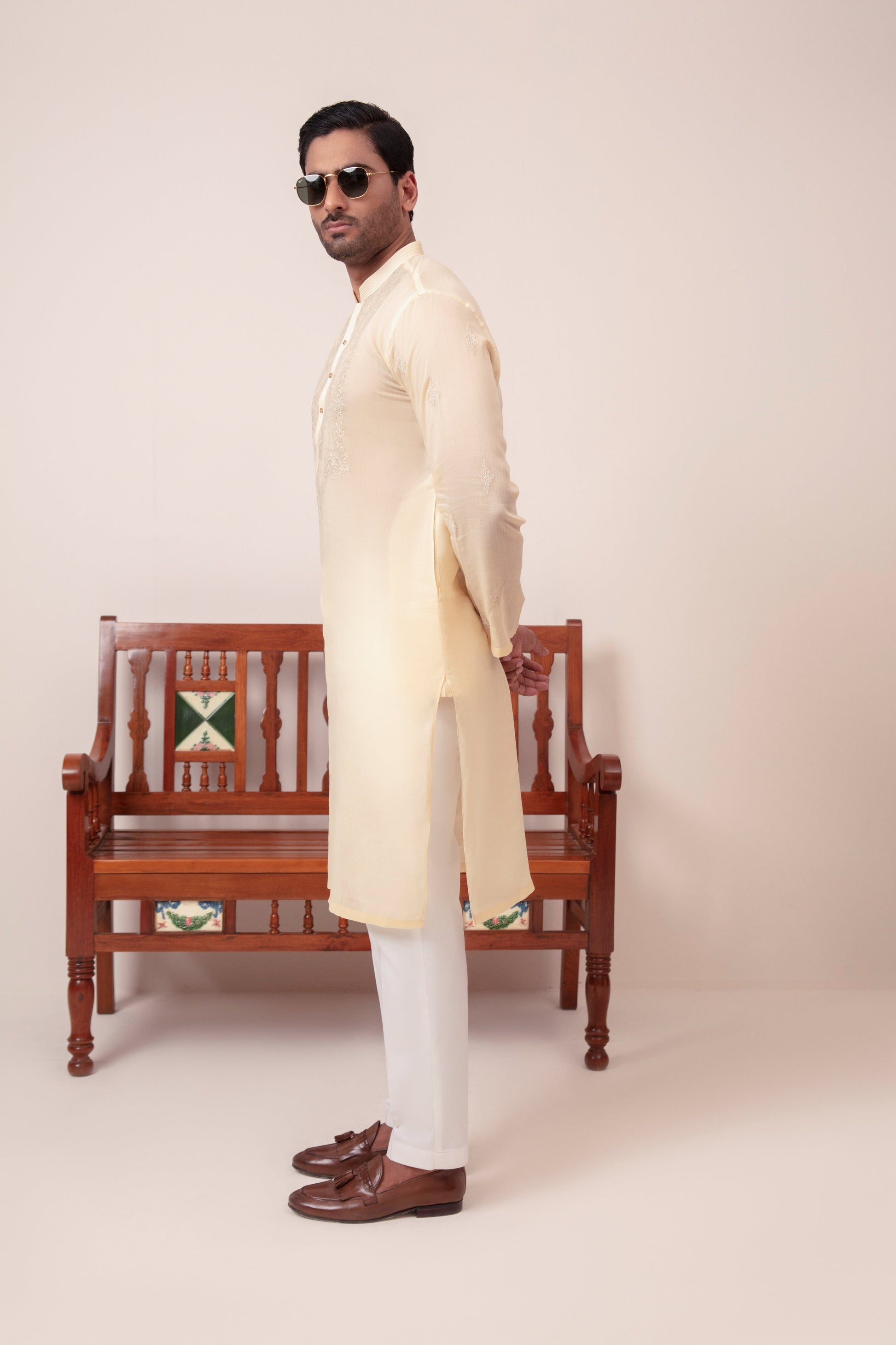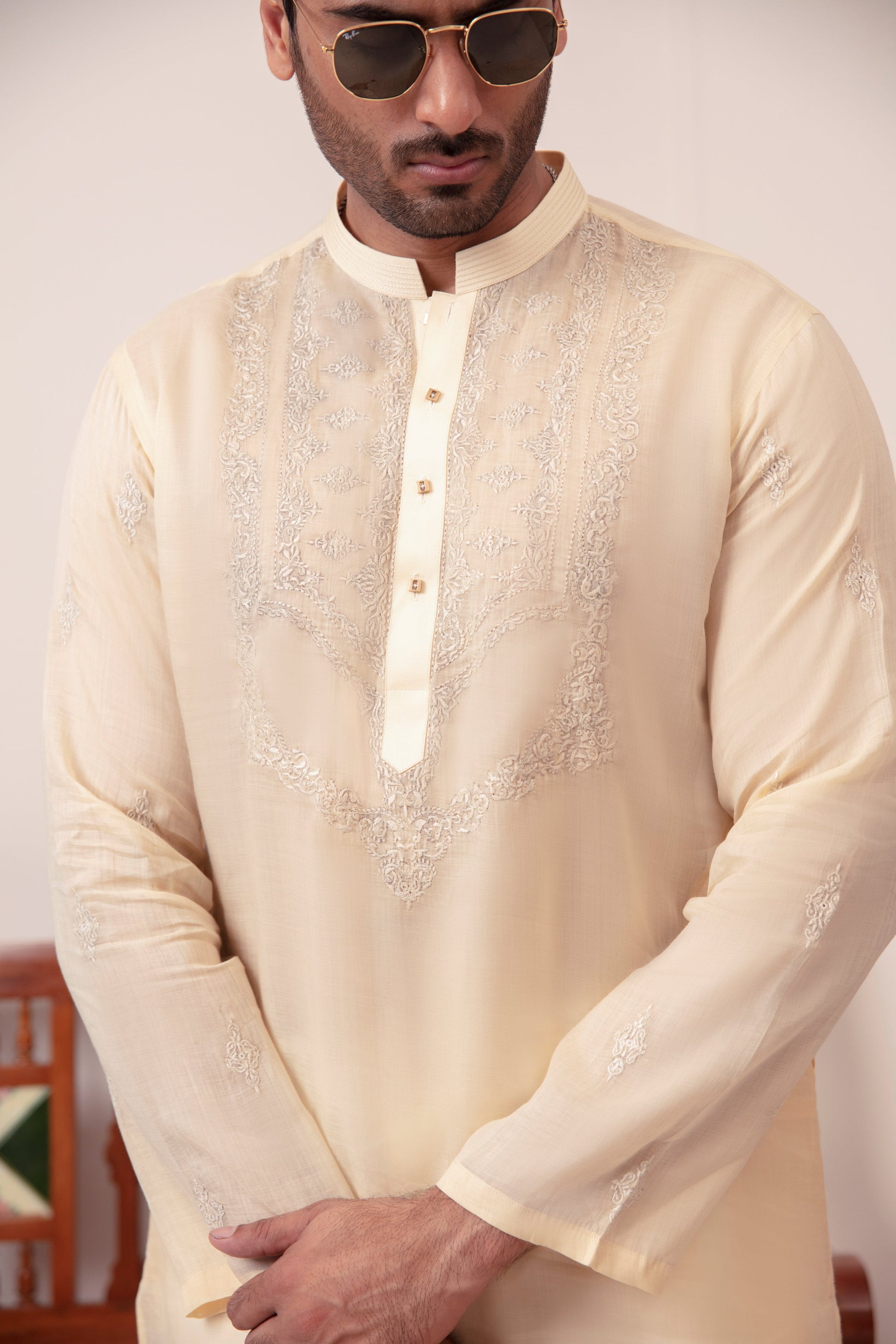 Ghalib Qureshi's Irish Cotton Pastel Yellow Kurta, featuring light embroidery on the chest, subtle thread work on the collar, and a motif on the sleeves, paired with a white pajama. Crafted from summer-perfect fabric, this suit is ideal for both casual and festive wear,