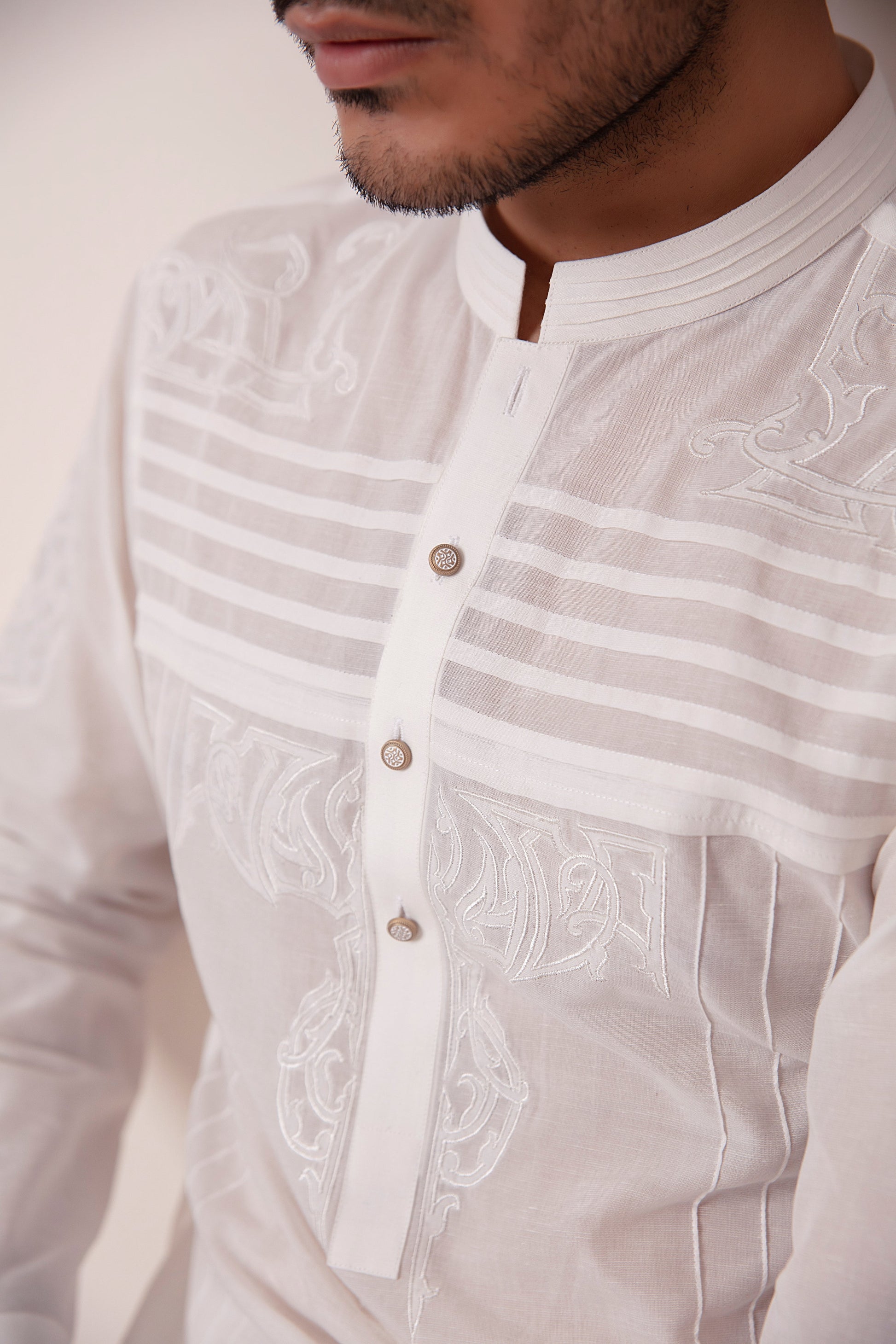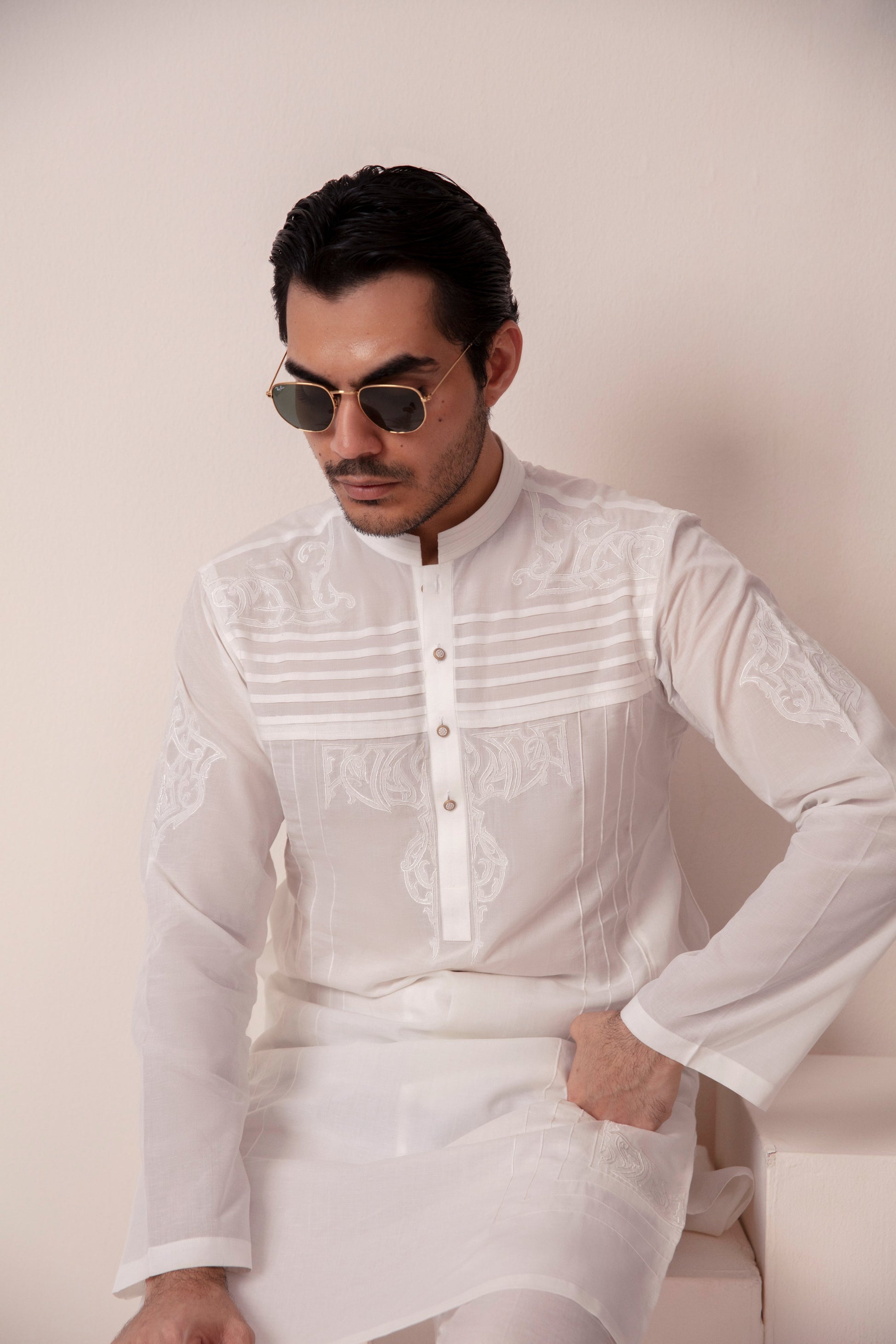 Ghalib Qureshi's Irish White Applique Work Kurta with matching plain pajama. Crafted from premium Irish fabric, this ensemble is perfect for summer and festive seasons. The delicate white applique work adds an elegant touch to the kurta, making it a sophisticated choice for any special occasion.