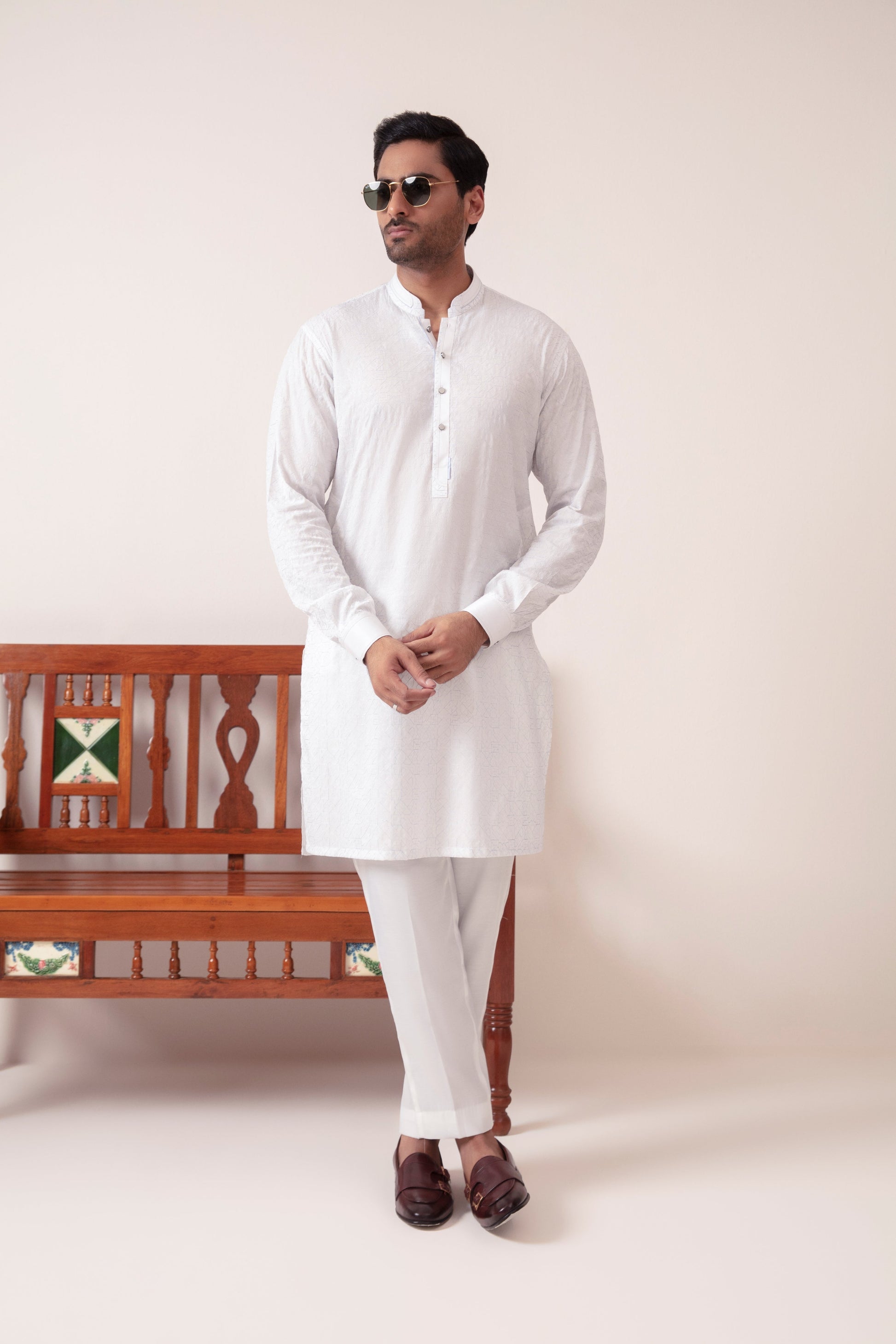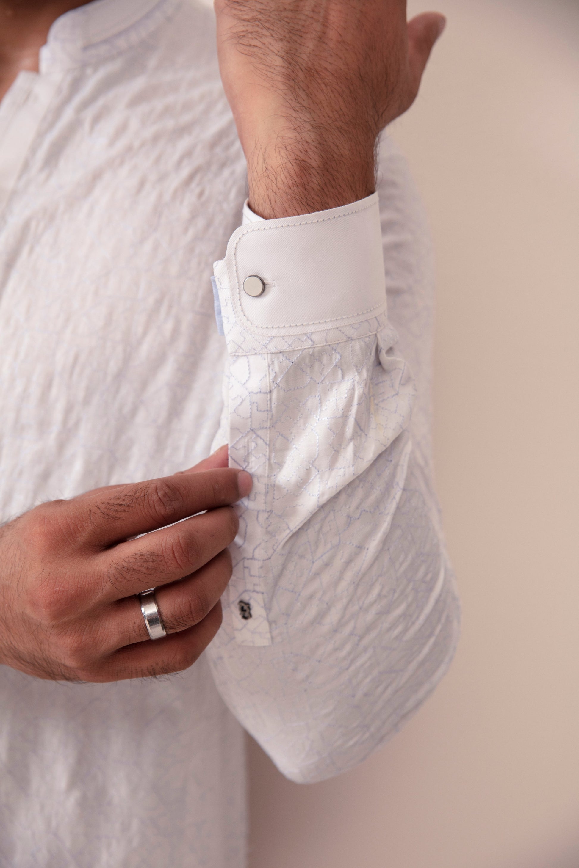 Ghalib Qureshi's White Fancy Blended Kurta, adorned with fully light blue embroidery, complemented by minor detailing on the collar, placket, and cuffs, finished with metal buttons. Paired with a matching plain pajama, this ensemble is perfect for summer, ideal for both casual outings and festive occasions. Enjoy the blend of style and comfort in this versatile outfit.