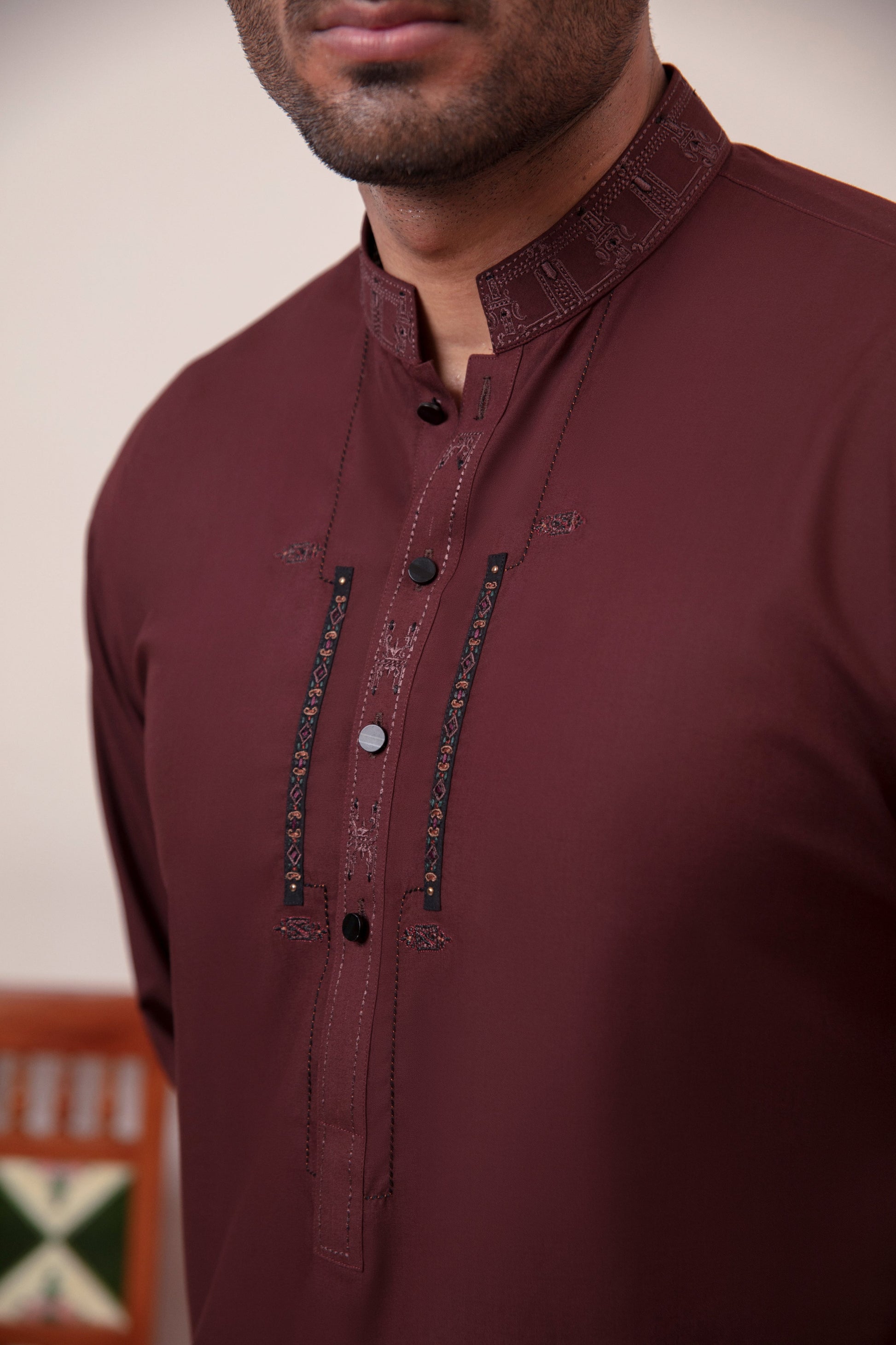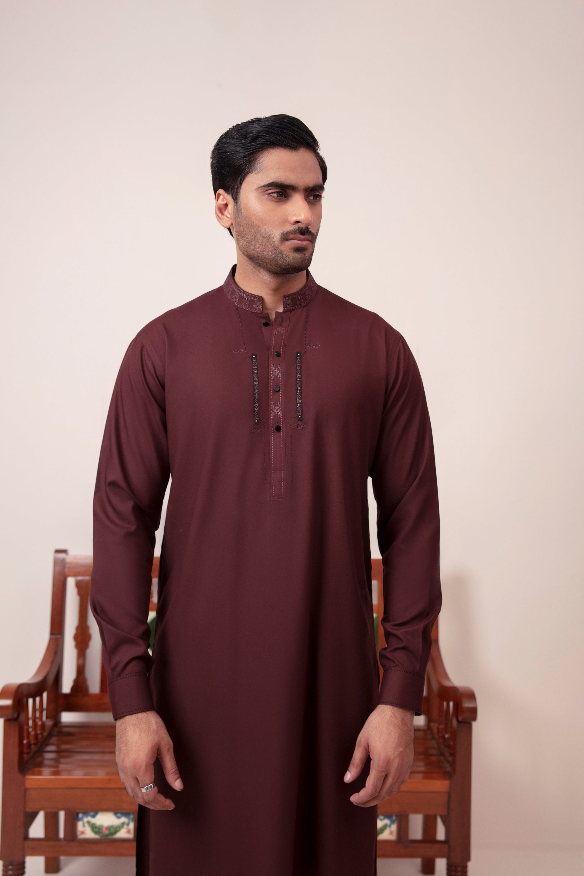 Ghalib Qureshi's Maroon Blended Kameez Shalwar, featuring intricate embroidery on the collar, front, and cuffs, adorned with elegant metal buttons. Crafted for summer comfort, this versatile suit effortlessly transitions between casual and festive occasions, offering both style and breathability.