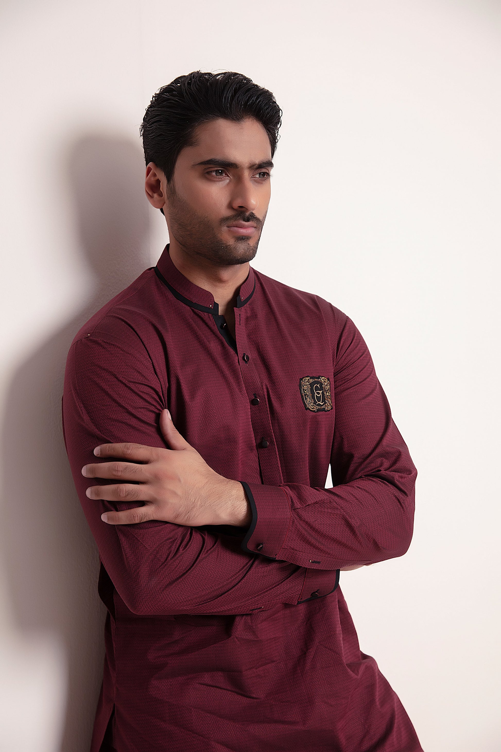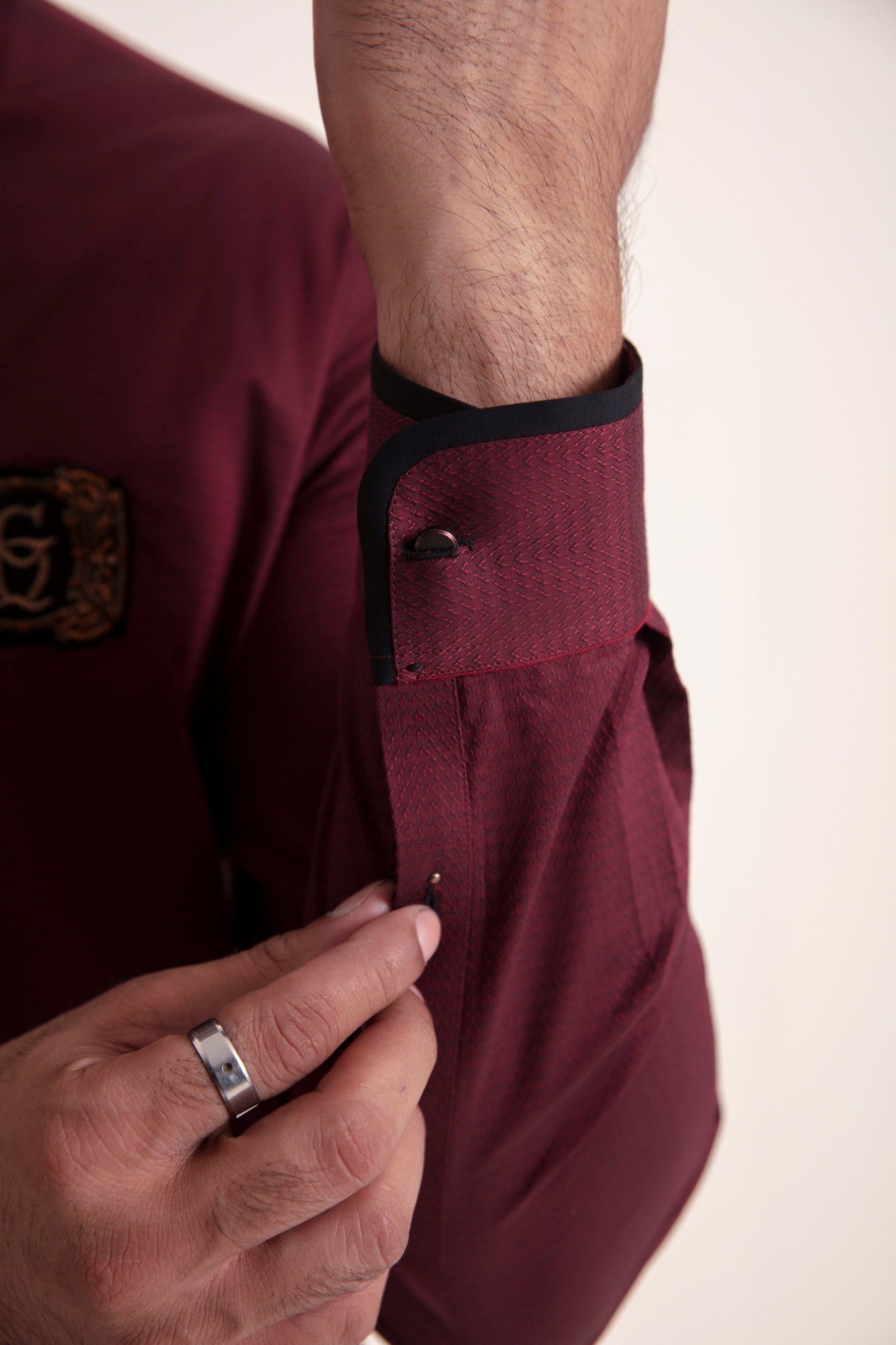 Ghalib Qureshi's Maroon Cotton Jacquard Kurta Pajama, featuring a handwork motif on the front, a contrast collar, and metal buttons. Crafted from premium cotton, this outfit is perfect for both casual and festive wear, making it ideal for summer and festive seasons. The intricate details and breathable fabric ensure comfort and style in any setting.