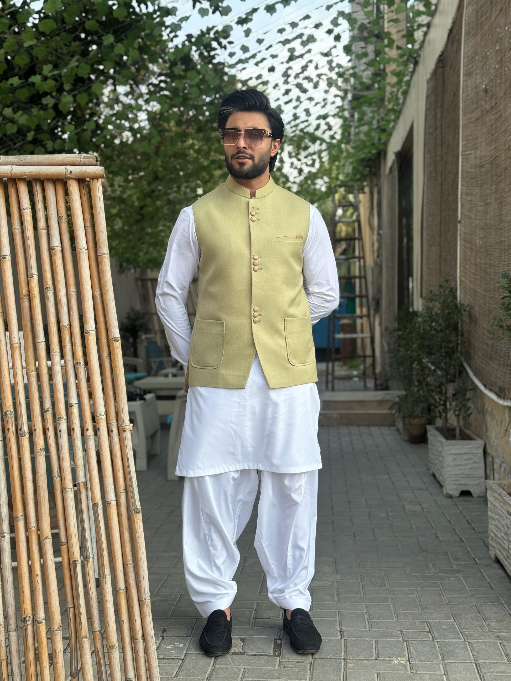 Stylish mint green waistcoat, crafted for elegance and versatility. Perfect for pairing with kameez shalwar or kurta pajama.