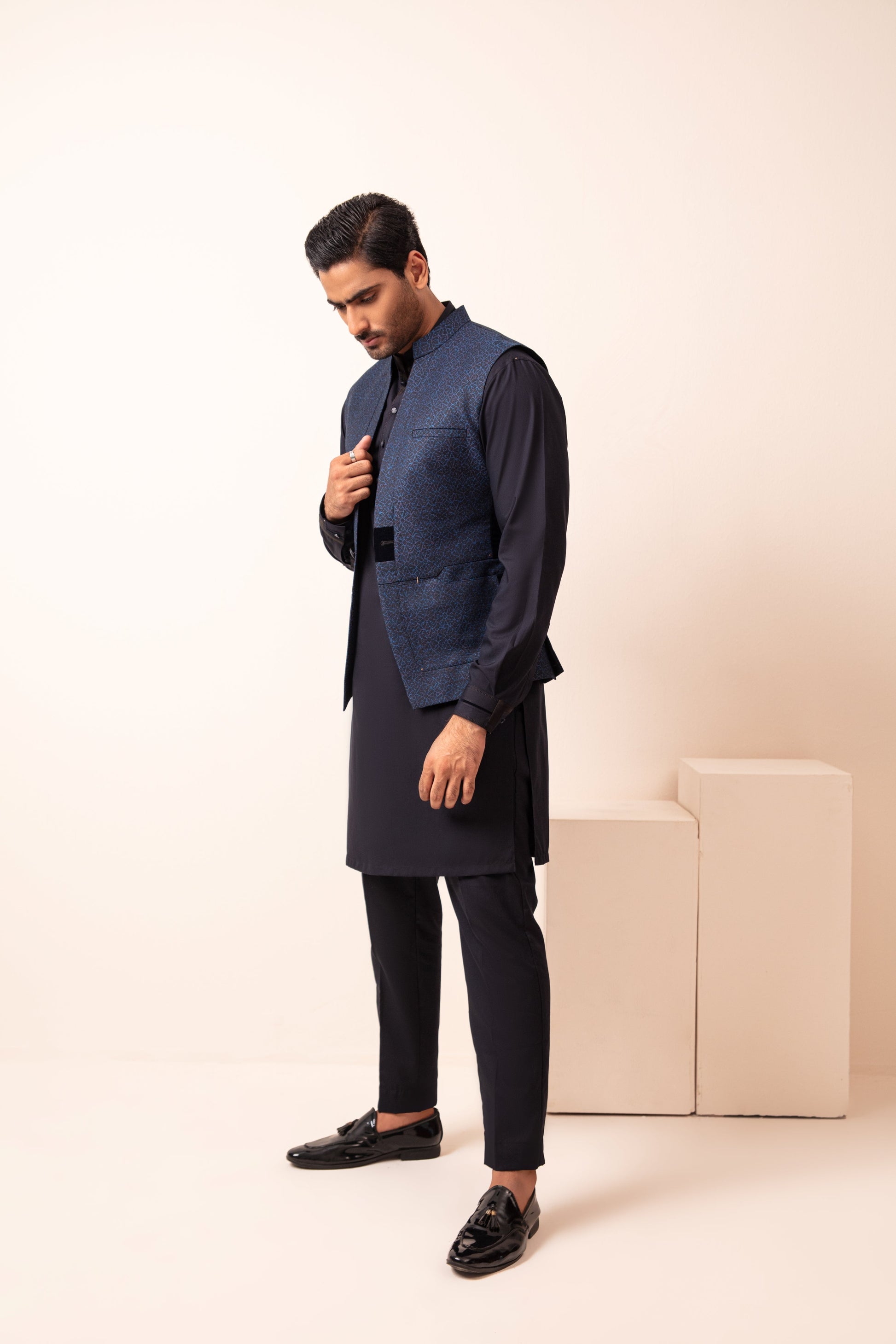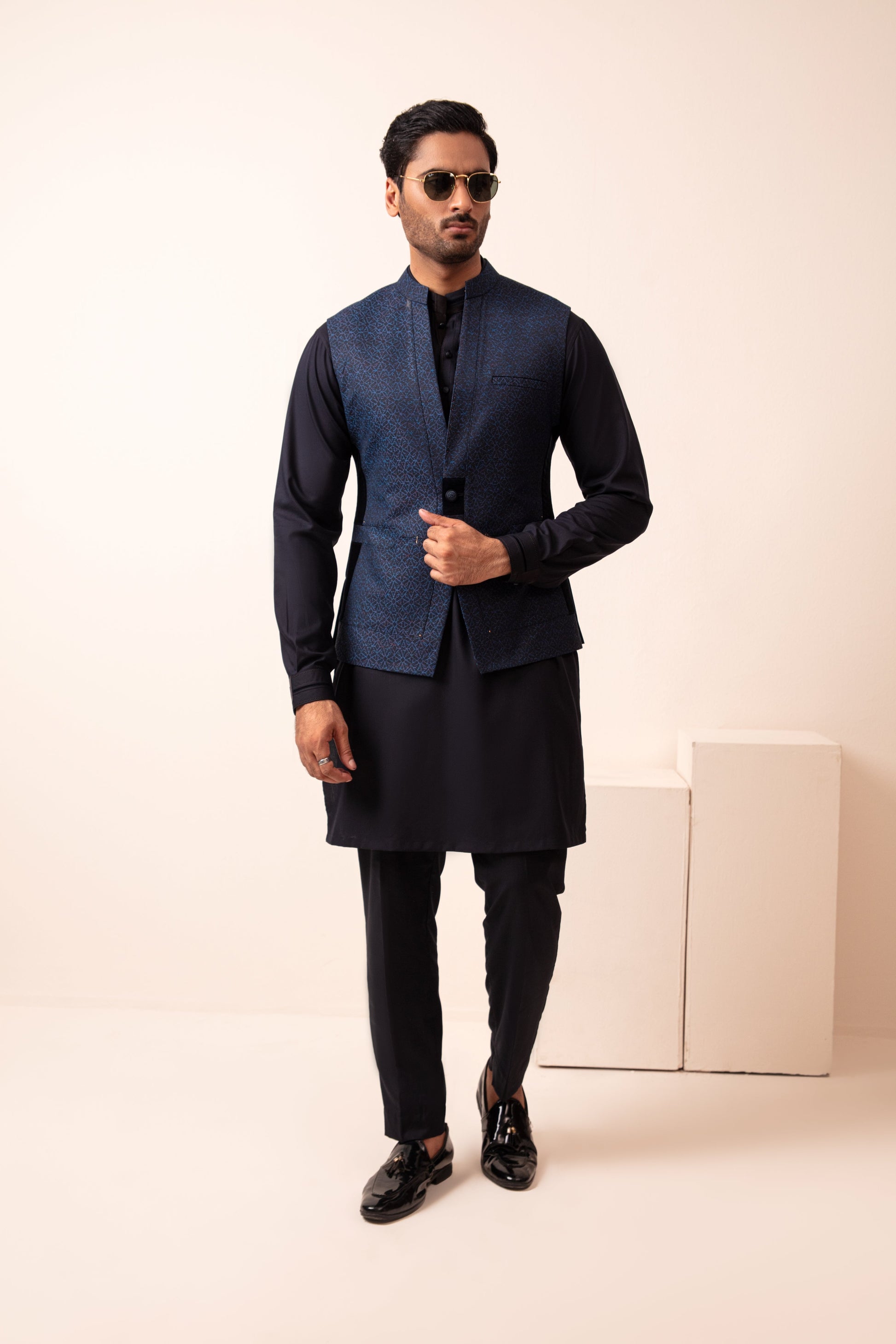 Ghalib Qureshi's Navy Blue waistcoat, adorned with subtle detailing and unique cut, ideal for festive and formal occasions.