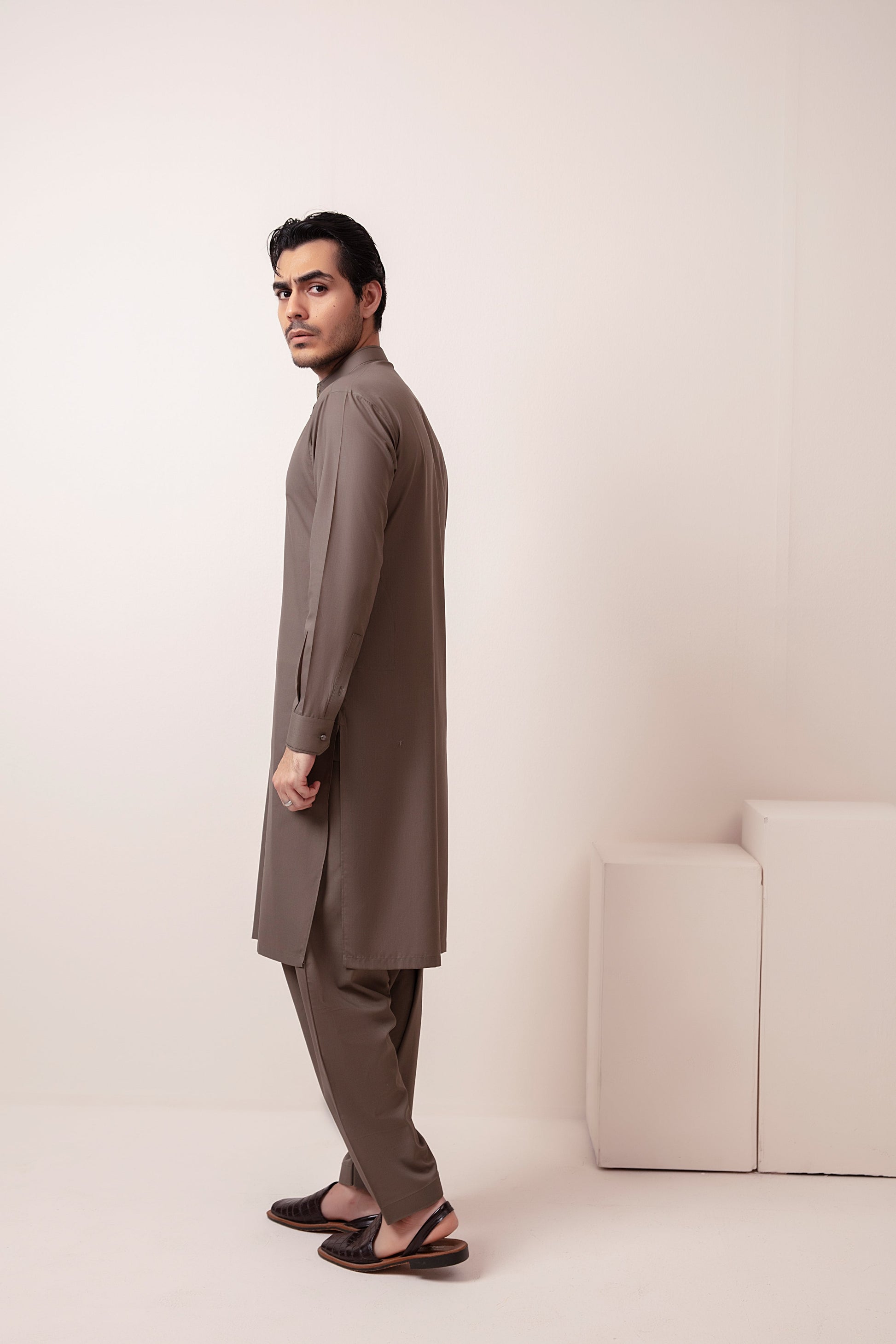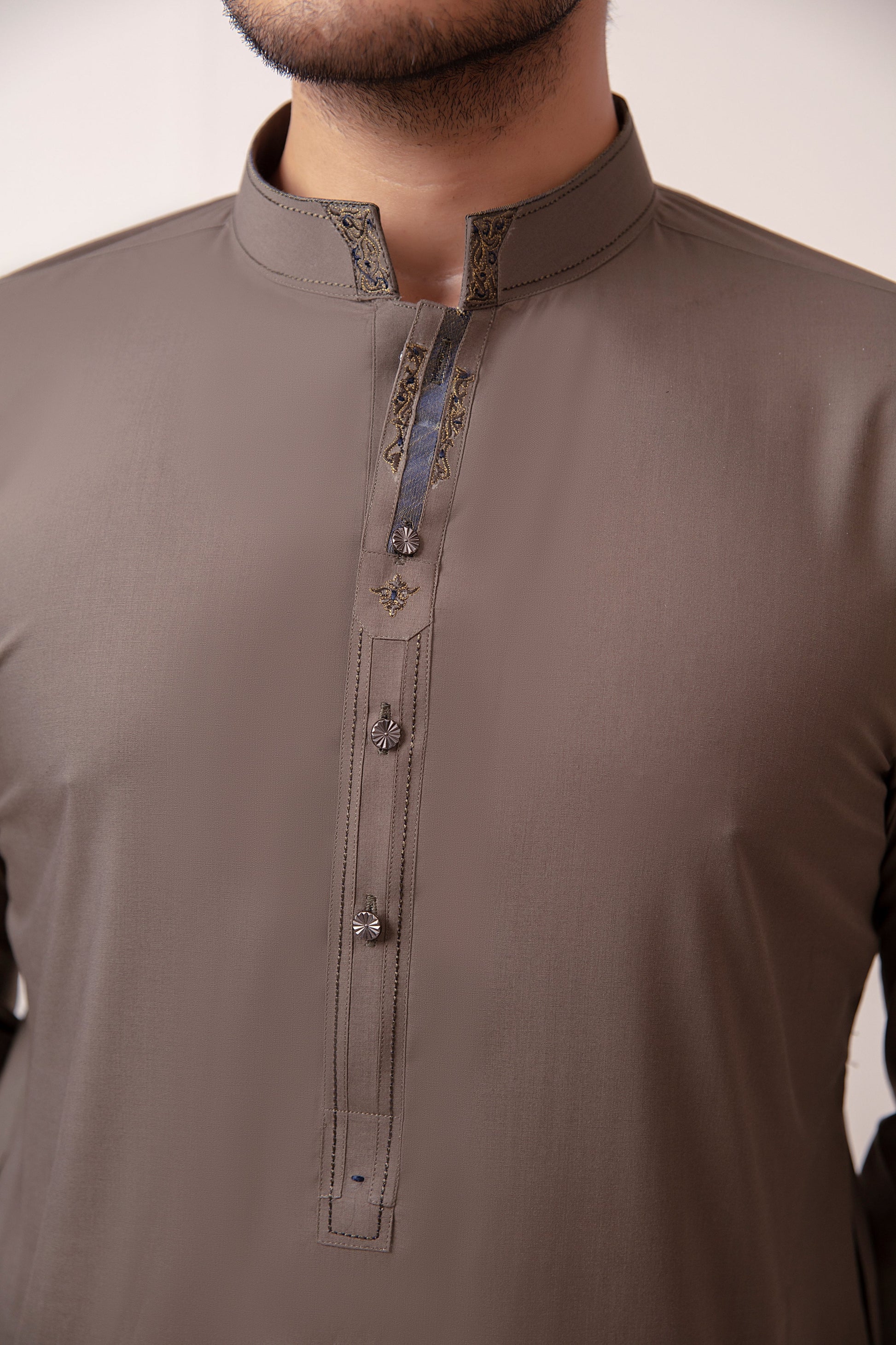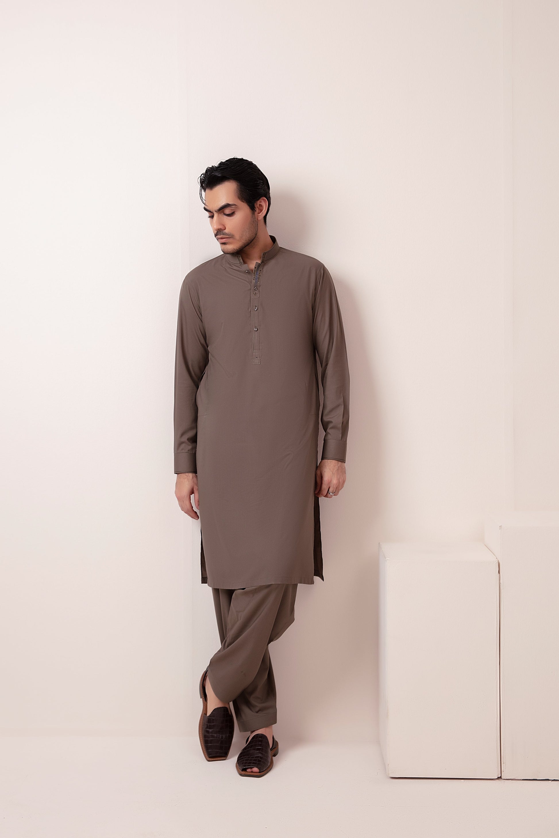 Ghalib Qureshi's Olive Green Blended Kameez Shalwar, featuring minor detailing on the collar, placket, and cuffs. Crafted from summer-perfect fabric, this versatile suit is ideal for both casual and festive wear