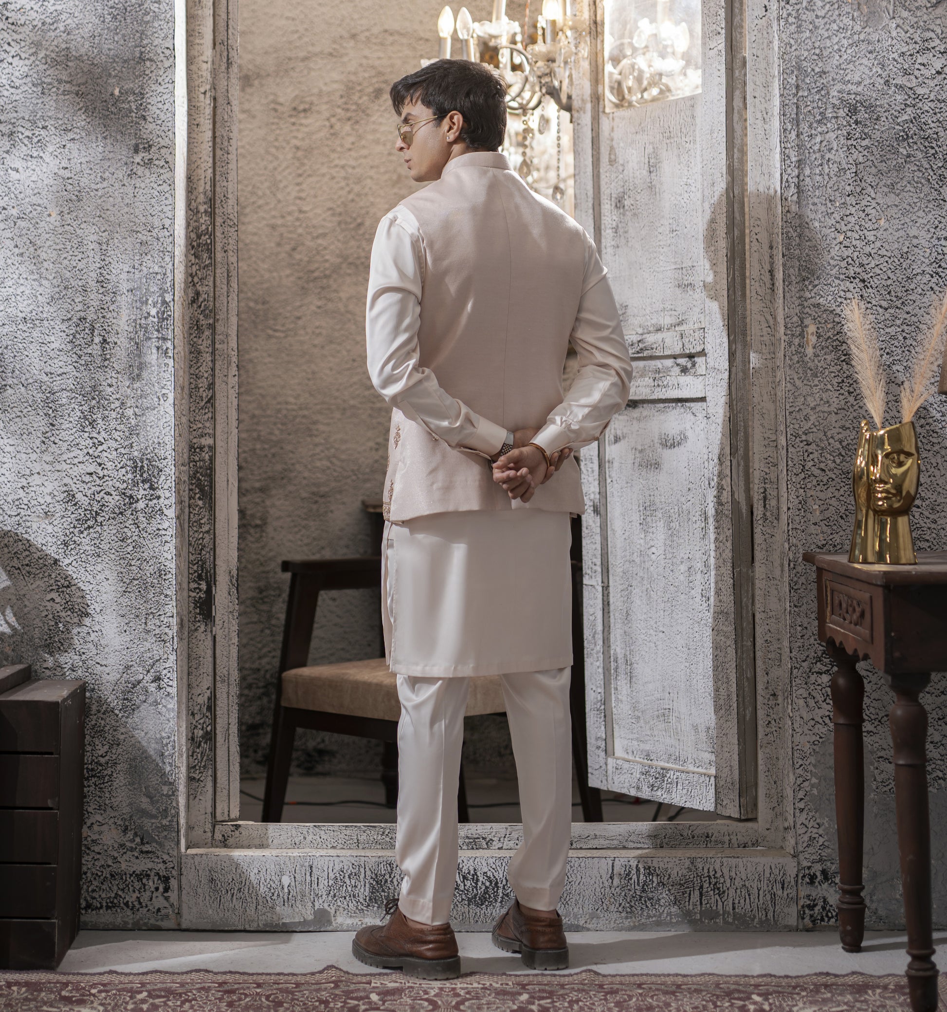 Soft yet commanding, this powdered pink ensemble is an exploration of modern regality. The hand-embroidered waistcoat, delicately detailed by master craftsmen, introduces a refined play of texture against the purity of a white kurta and pajama. The pastel hue brings a fresh, contemporary softness, while the precision of the embroidery anchors the look in heritage.