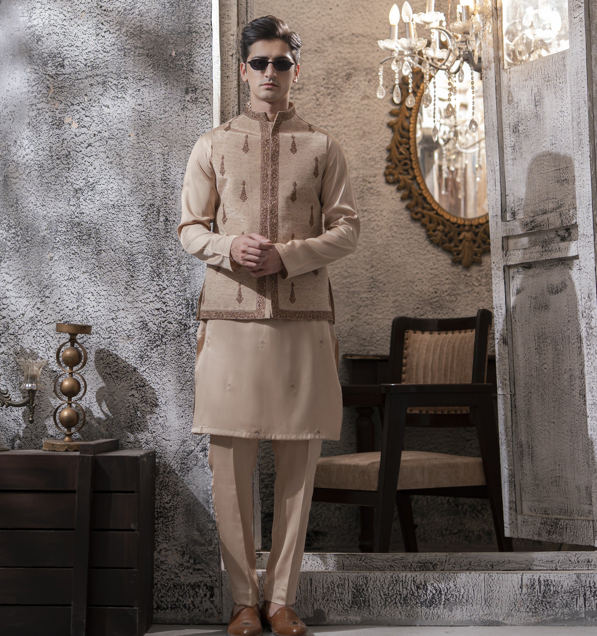 An ode to quiet opulence, this sand beige ensemble redefines ceremonial dressing with understated grandeur. The hand-embroidered waistcoat, meticulously crafted by skilled artisans, rests atop a fluid kurta and pajama, creating a silhouette that is both regal and effortless. Subtle textures and refined embellishments lend depth without excess, allowing craftsmanship to speak louder than ornamentation.
